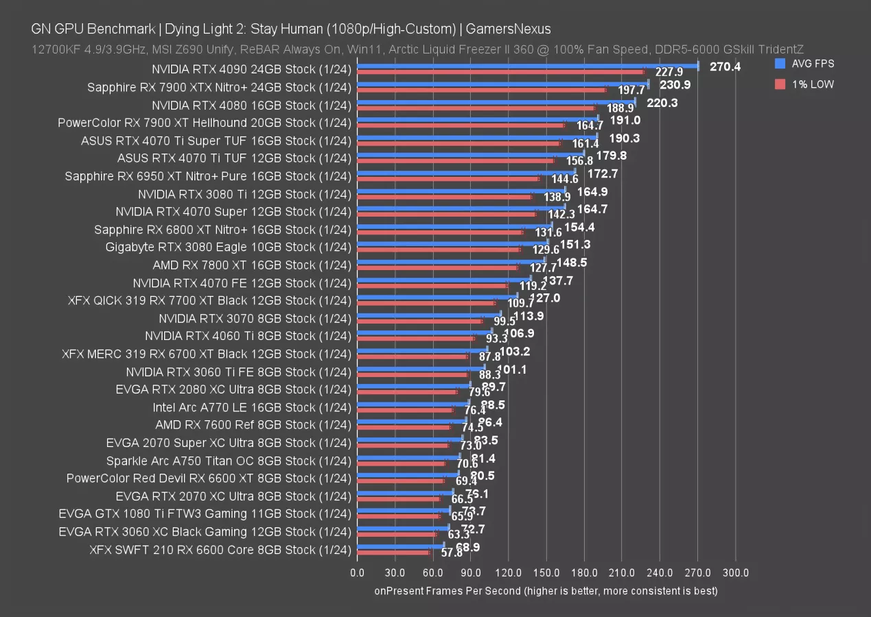 Dying Light 2 is a 2022 game. Tested at 4K first, the 4070 Ti Super leads the 4070 Ti by 12.6%, better than we saw in the last game. The 7900 XT is about equal with the 4070 Ti Super and can’t be told apart at a functional level.