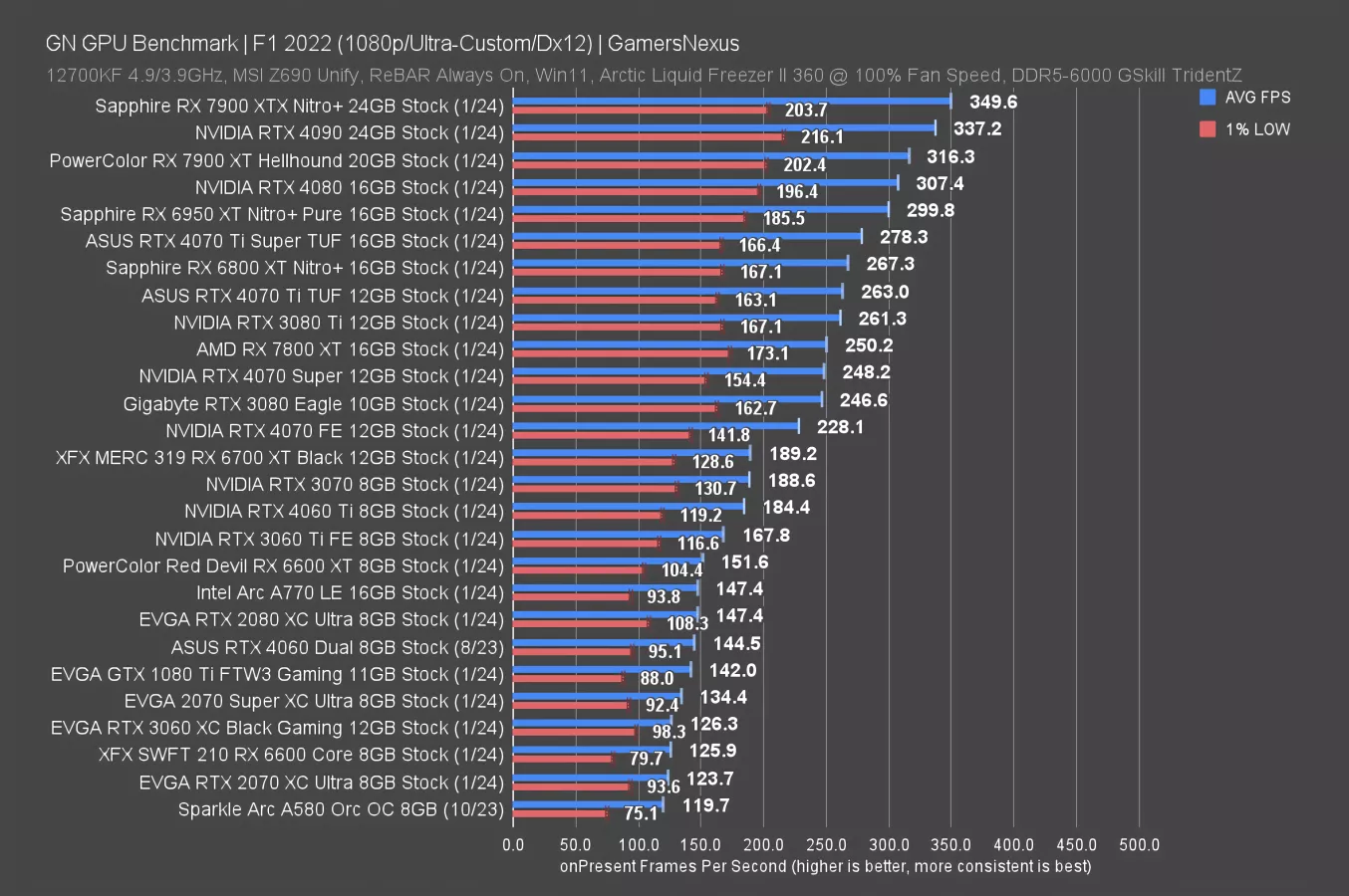 The 4070 Ti Super ran at 129FPS AVG here, establishing a 15FPS lead over the 4070 Ti, or about 12.5%. The 7900 XT sits close to the Ti Super, but behind it -- and AMD has worse 0.1% lows in this game than would be proportional to the average.