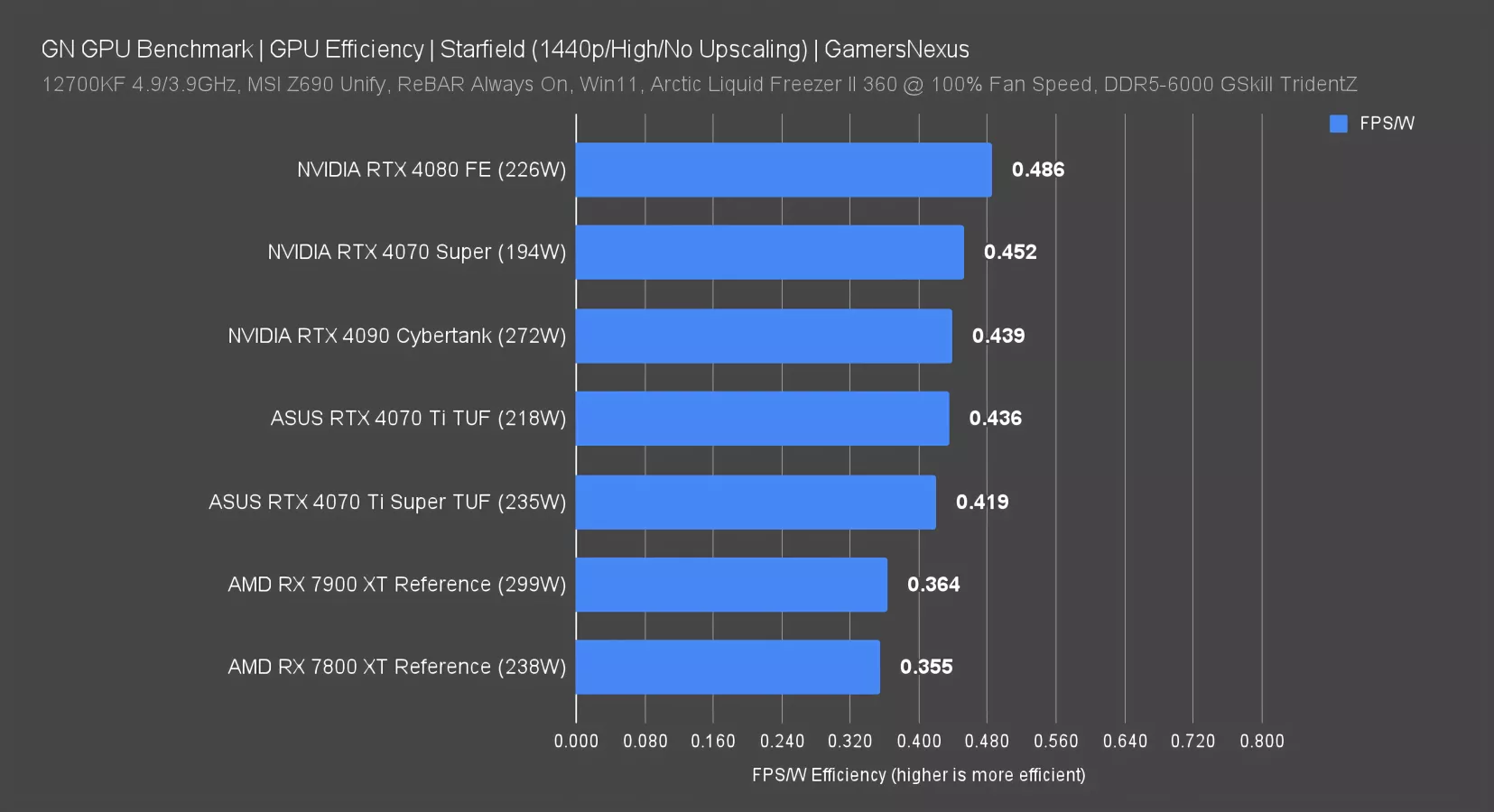 First, on our side of things: The efficiency testing is exciting and there’s a lot of room for us to improve on it. The methodologies aren’t final nor are the choices of data presentation, so remember that when we add new tests, it’s sort of a living document. We’ll keep iterating on this until we land on something we feel like covers the hardware well. That’ll just mean a lot of trial and error on identifying the test cases and the scaling. It’s a cool start, though, and will give us some new insight into performance outside of elements like frame time, frame pacing, frame rate, and power. For latency, we’re actually already overhauling our next iteration on that and plan to re-introduce it for the 4080 Super review. We debuted it last week and liked how it turned out, but we want to fine-tune the testing and so made way for efficiency instead. This is just us experimenting with new types of data presentation.