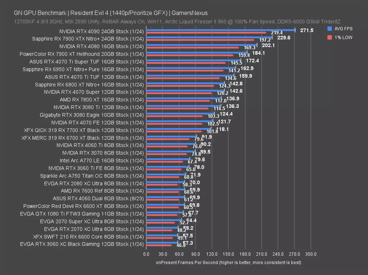 Finally for Resident Evil RT, 1080p has the 4070 Ti Super at 201 FPS AVG with FSR, reducing the lead over the Ti to 5.7%. The 7900 XT sits between the two of them and is closer to the original 4070 Ti than the 4070 Ti Super.