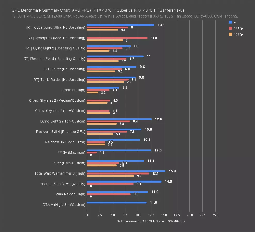 The 4070 Ti Super is still bested by the 7900 XT, this time by 6.8%. This chart added a bunch of mid-range cards from ages past, so for some potential pathways: The RX 6600 at 58 FPS AVG, the 6600 XT at 70 FPS AVG, the 3060 XC at 57 FPS, and the 3060 Ti at 78 FPS would see an improvement, respectively, of 200%, 147%, 201%, and 121%.