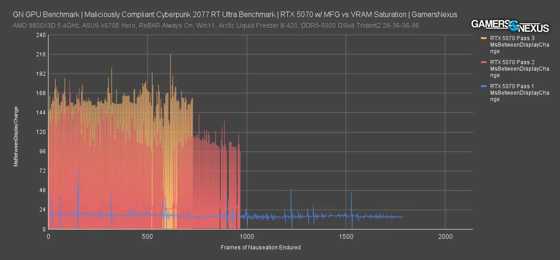 Here’s a quick chart showing passes 1 through 3 of the 5070 as it gets progressively worse with each benchmark pass as the framebuffer fills. The 4090, meanwhile, maintains its performance the entire time.