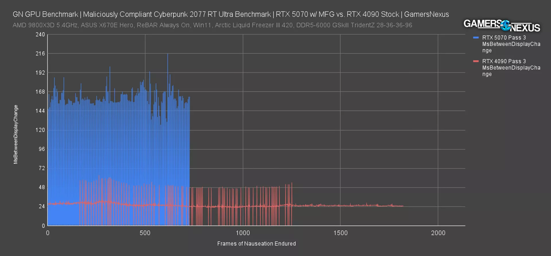 Somehow, and we don’t know how this happened, the RTX 4090 just seems to be better than the RTX 5070. That’s just so weird. Maybe we should run NVIDIA Multi-Fraction Generation to divide the 4090 down to a 5070.