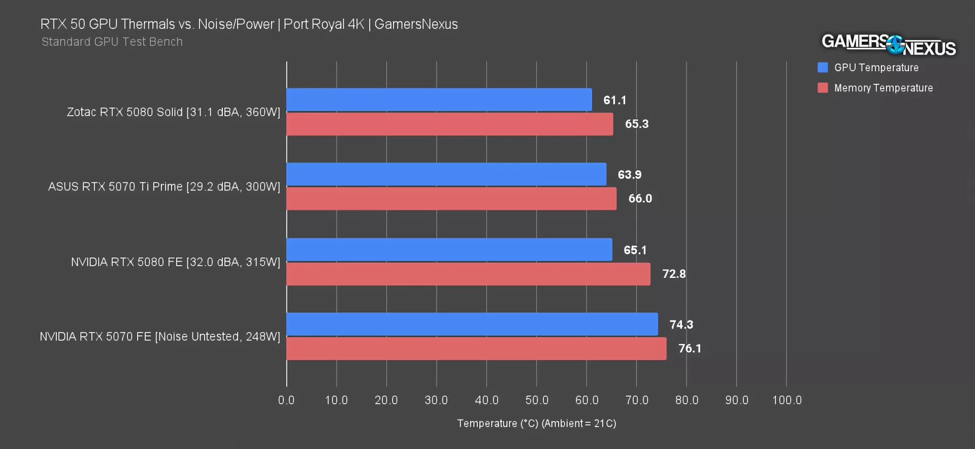 We’ll keep thermals short and simple. Using our usual benchmark of Port Royal at 4K and looping, we measured the 5070 FE at steady state at around 74 degrees Celsius for GPU core temperature. The memory temperature was about 76 degrees. Both of these numbers are acceptable; memory is well within spec and is completely fine. Core has some room for a hotter computer case. The core temperature isn’t impressive, but is acceptable, and there’s a little bit of buffer there.