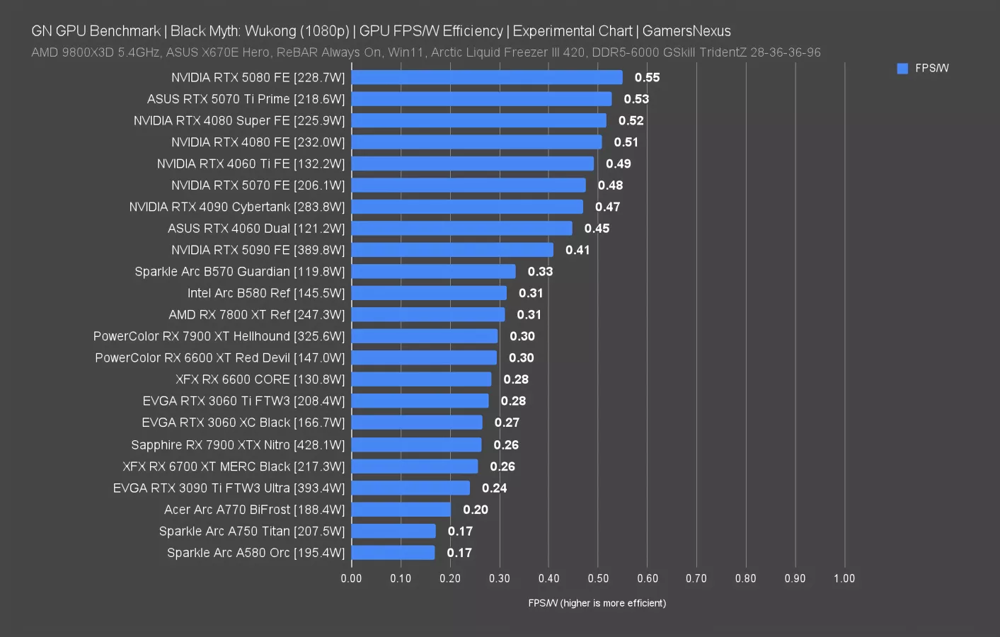 At 1080p and still with RT, the 5070 ran at 0.55 FPS/W, again giving the 5070 Ti a 13% efficiency advantage. We’re curious to see where the 9070 and 9070 XT land. The 7900 XT isn’t competitive in efficiency, with a lot of this particular result being because of its relatively low RT performance last generation. That’s what AMD is trying to tackle.