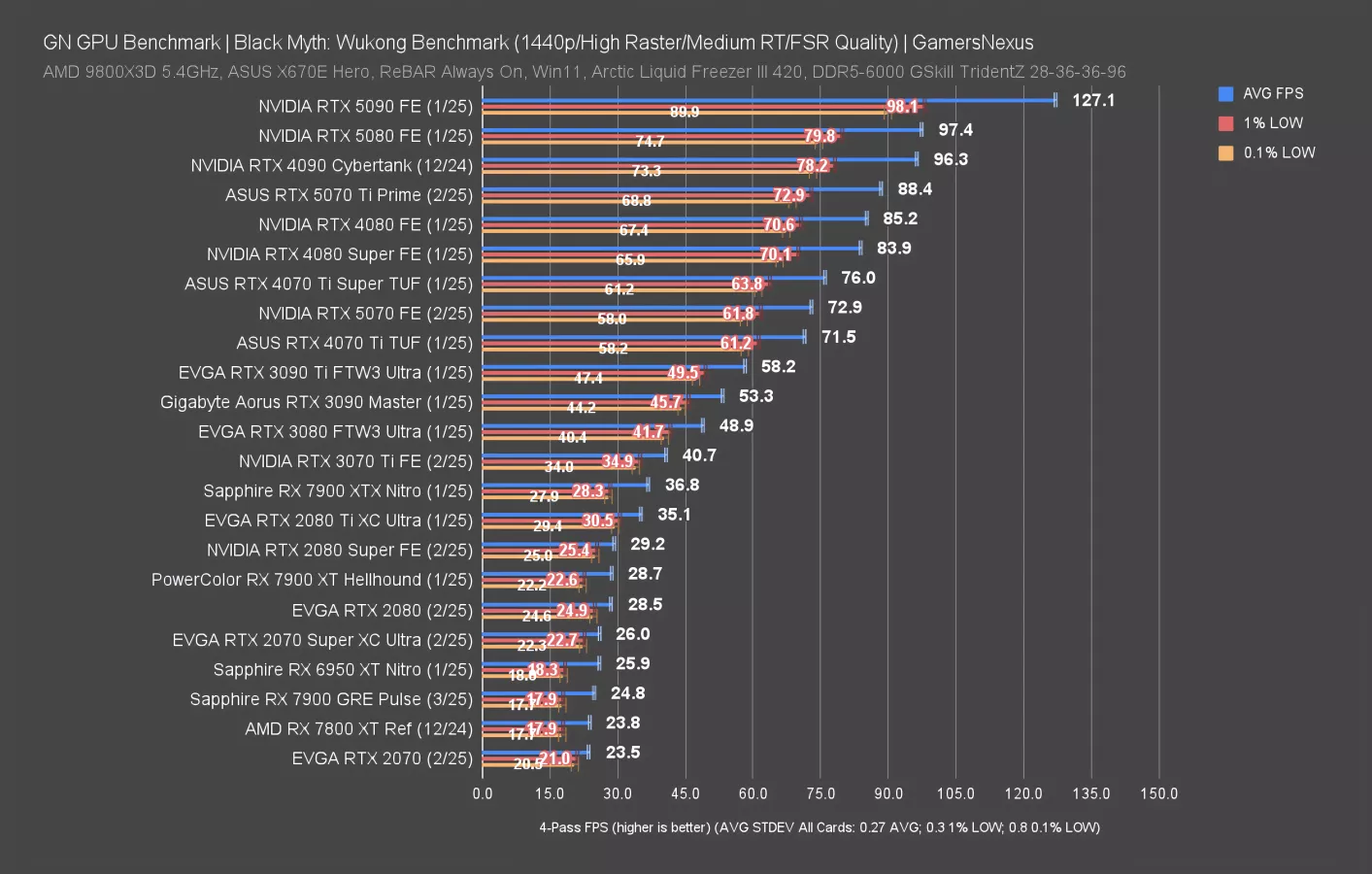 At 1440p, the 5070 Ti ran at 88 FPS AVG, the 5070 at 73 FPS AVG (between the 4070 Ti and 4070 Ti Super), and the original RTX 70-class card ran at 24 FPS AVG. AMD’s best here, as of today and not tomorrow, is the 7900 XTX at 37 FPS AVG.