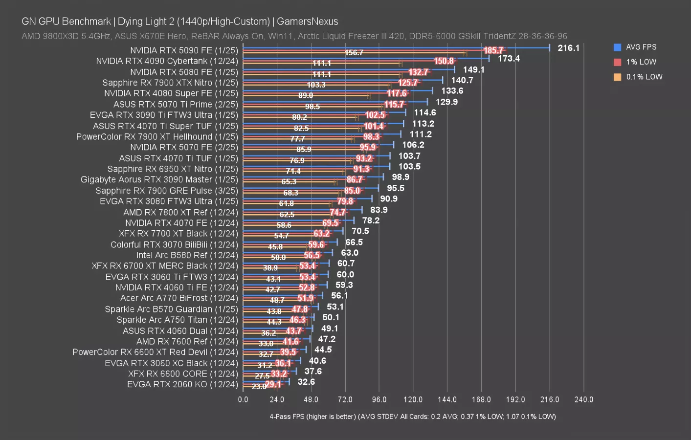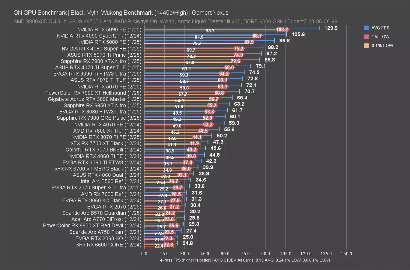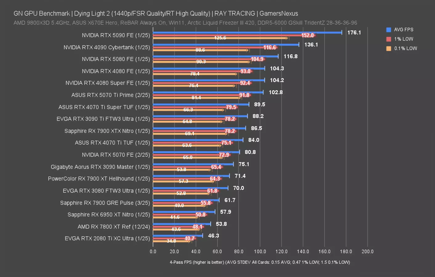 At 1440p, the 5070 held a 152 FPS AVG and trailed the 4070 Ti by 8 FPS. The 5070 Ti is 30% higher framerate here, down from 36% at 4K. As we’ve seen, the gap tends to close at lower resolutions, although it’s still a huge gap in this game.