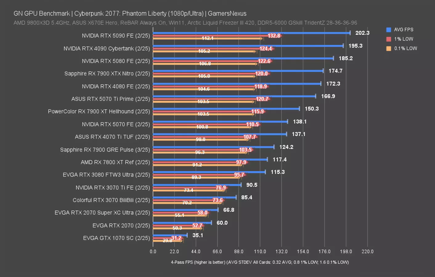 1080p reintroduces other 70-class cards: The 5070 Ti ran at 167 FPS AVG, with the 5070 at 138. That’s still 21%. The 4070 hasn’t been rerun here yet, but the 3070 is present at 85 FPS, yielding a 62% lead to the 5070, followed by the 2070 at 60 FPS for 130%, then the GTX 1070 at 35 FPS AVG. That’s about a 293% improvement to the 5070.
