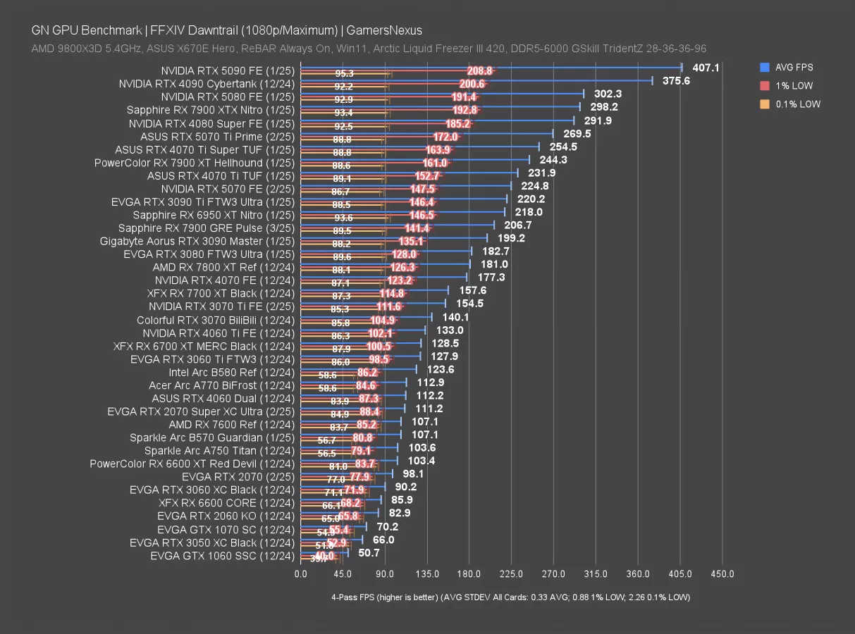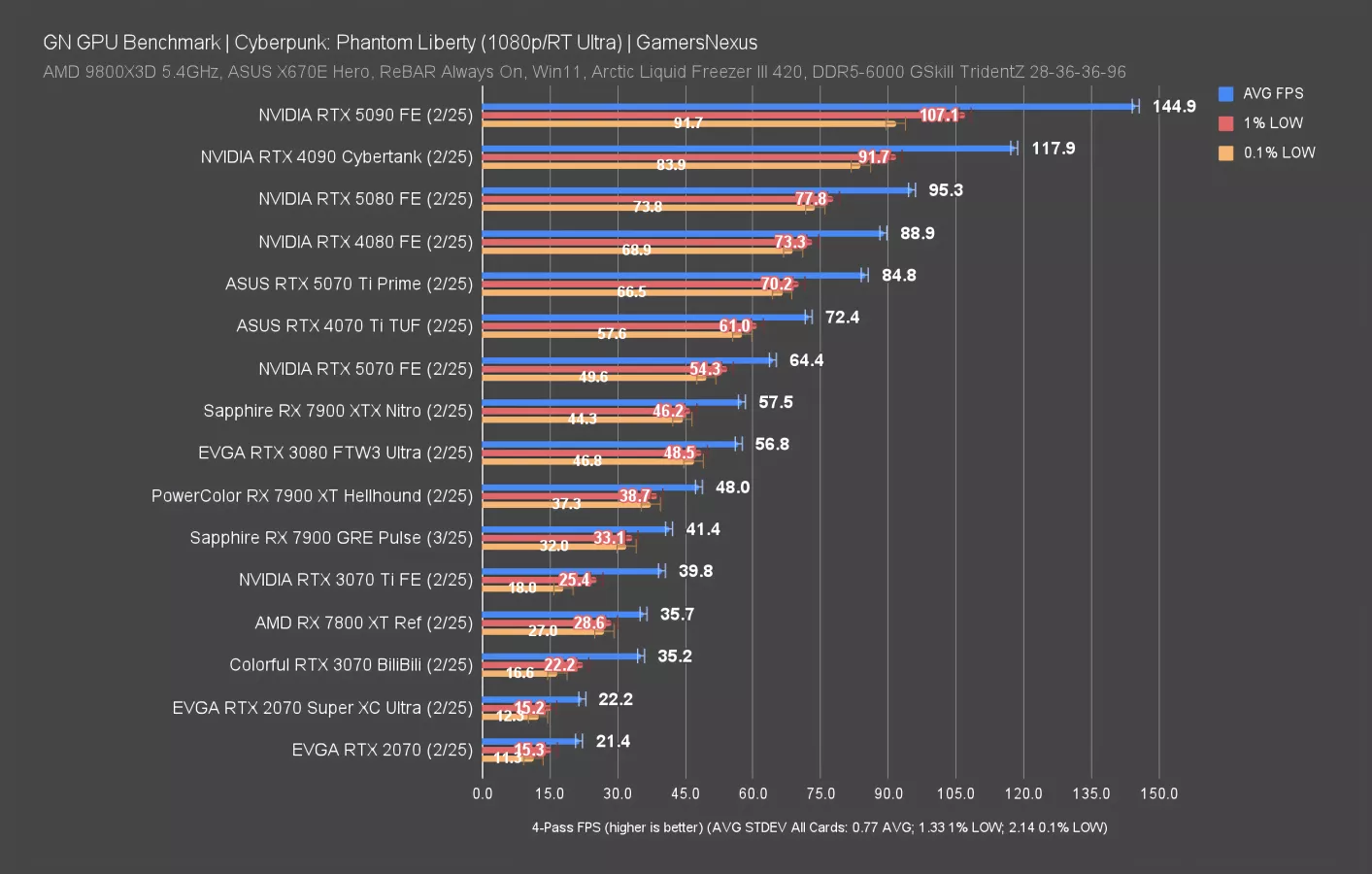 At 1080p, the 5070’s 126 FPS AVG has it just behind the 4070 Ti. The 7900 XT leads by only 7% here, with the 5070 Ti knocked down to a 21% lead from 25% at 1440p. The 5070 Ti’s 151 FPS AVG is also about the same as the 7900 XTX, which has its own slight advantage.