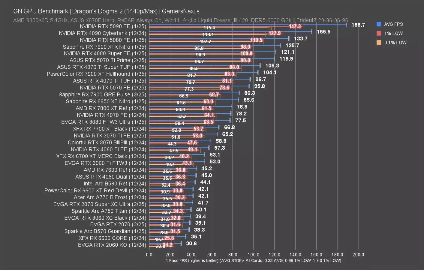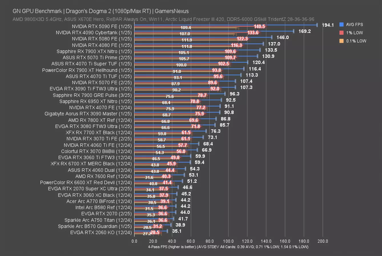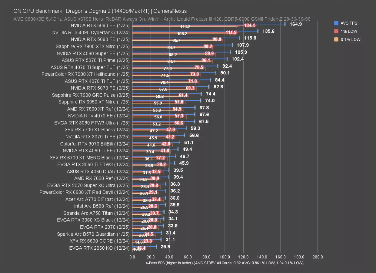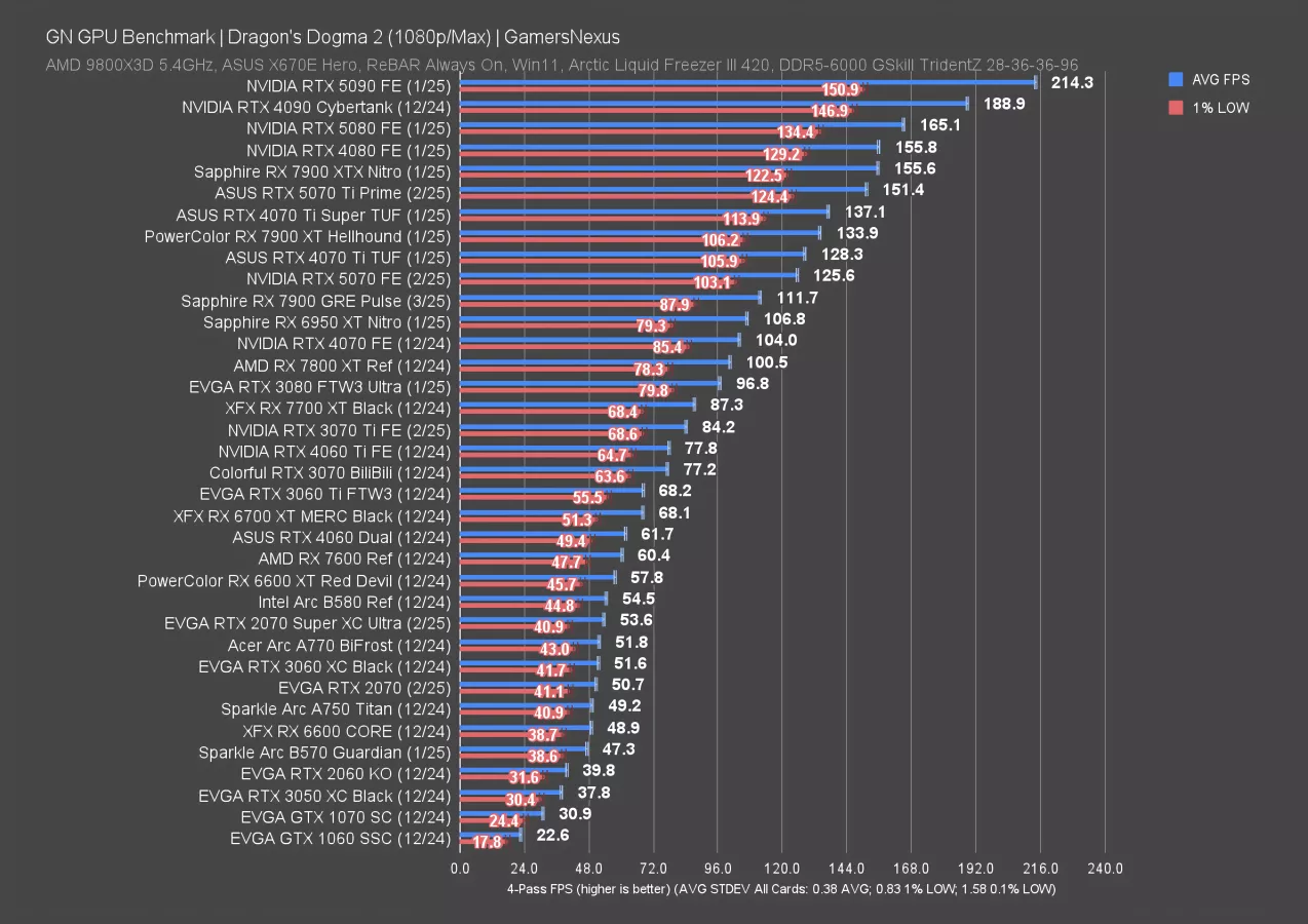 At 1440p with RT, Dragon’s Dogma 2 puts the 5070 at 83 FPS AVG, reducing the 5070 Ti’s lead to 24%. The 7900 XT sits between both, with the 7900 XTX ahead of the 5070 Ti.