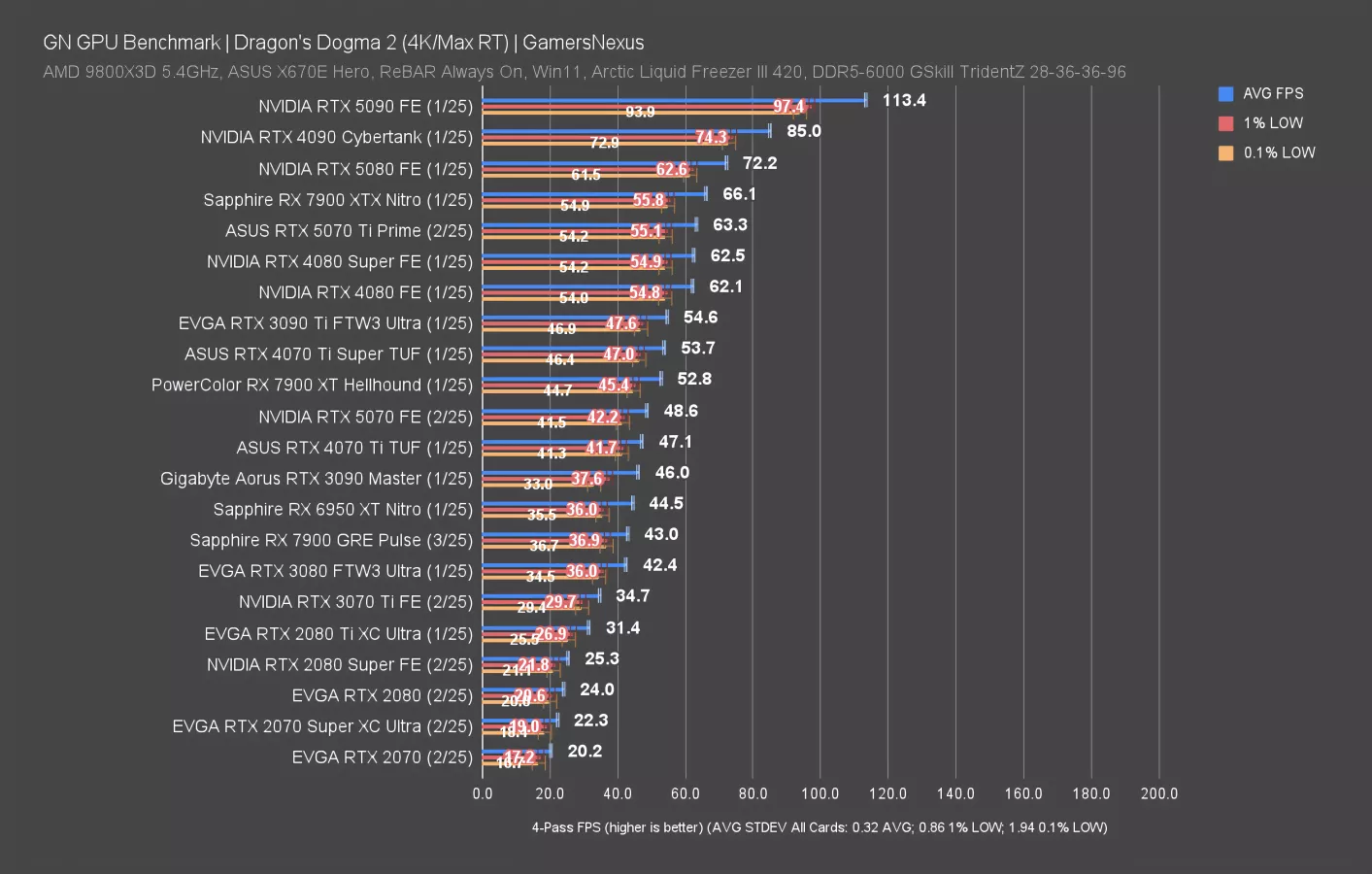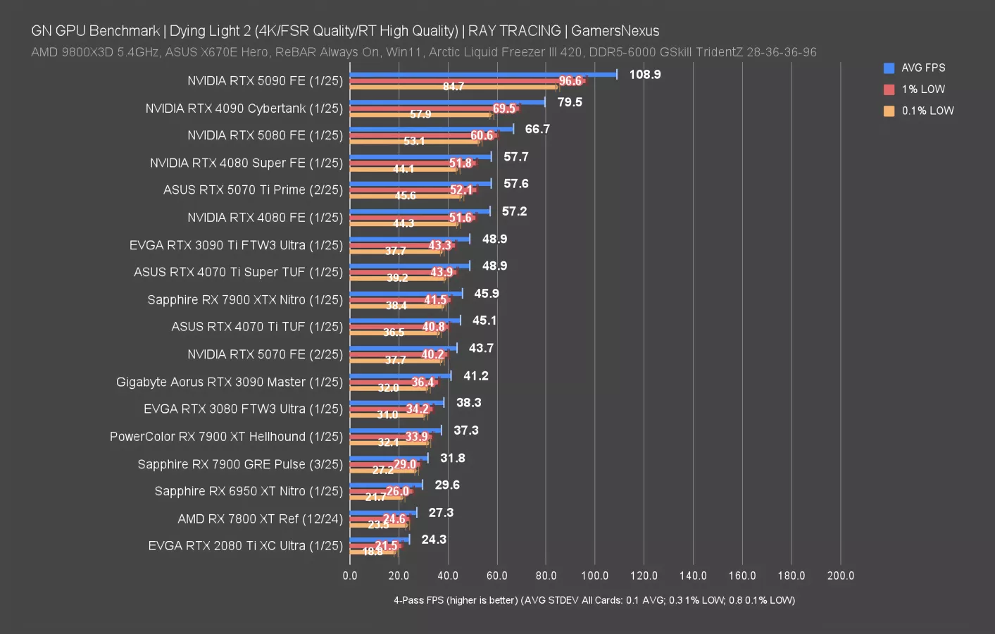 At 4K, the 5070 ran at 49 FPS AVG, establishing a 9% lead for the 7900 XT. That’s a similar gap to what we saw without RT. The 5070 Ti leads by 30% again here, with the 7900 XTX leading that.