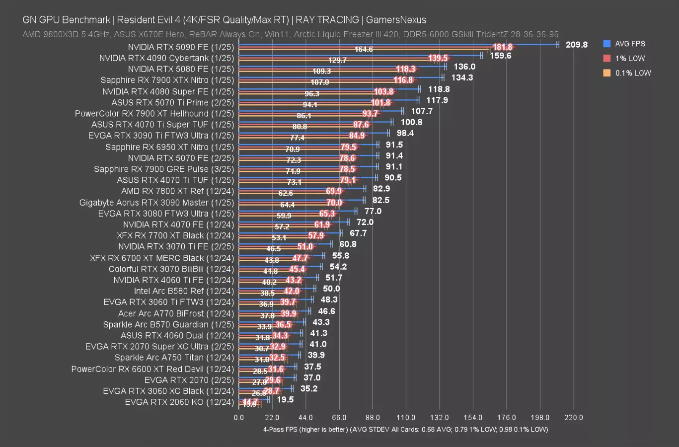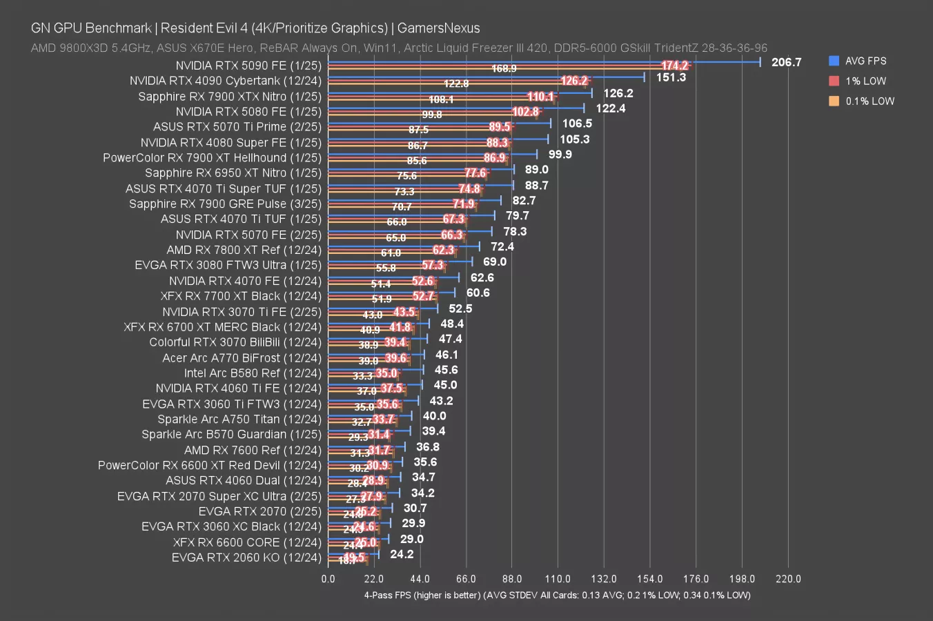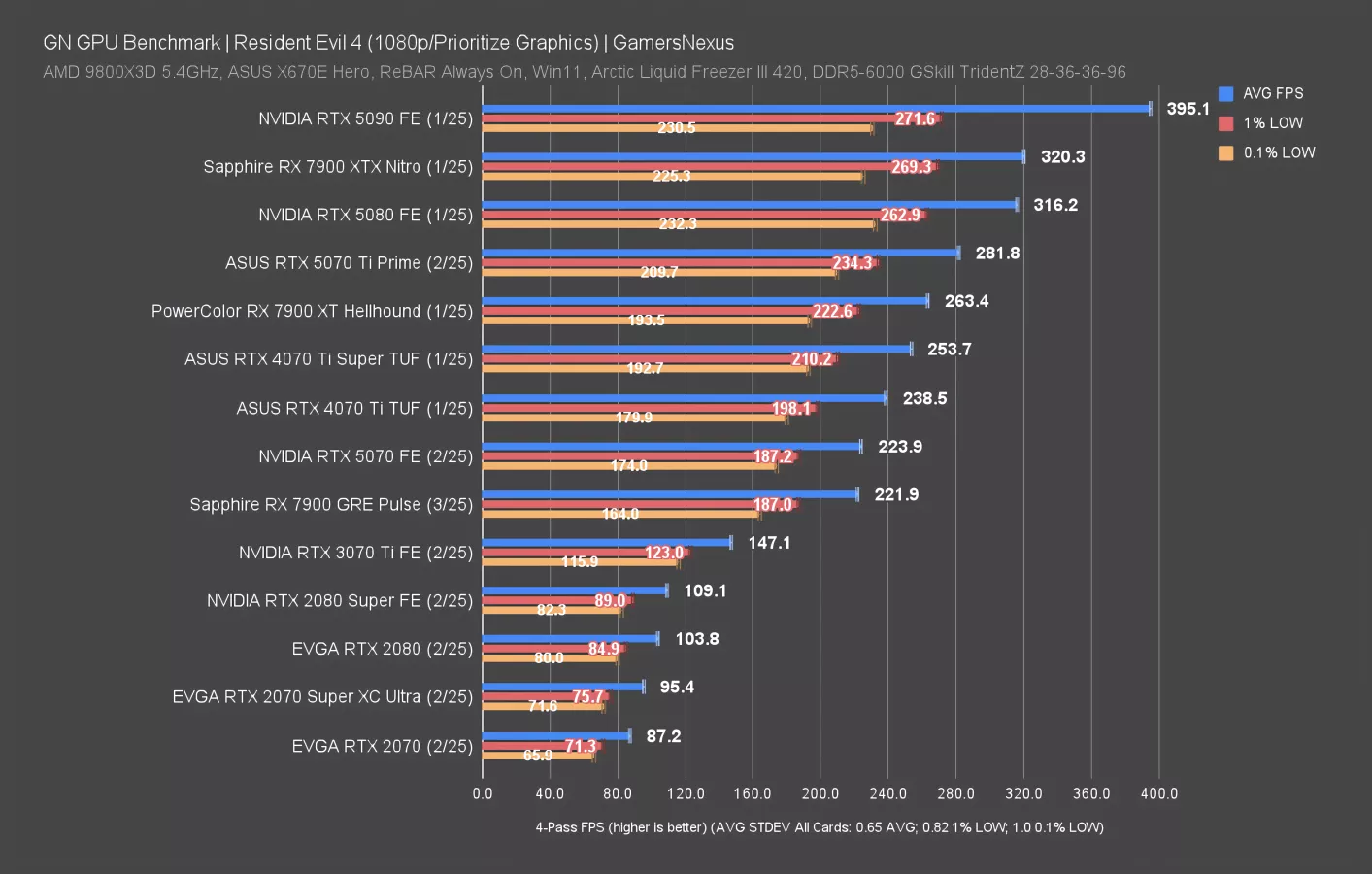 Resident Evil at 4K upscaled is next. This one has the 5070 at 91 FPS AVG, roughly tying the 4070 Ti once again. The 7900 XT leads the 5070 by 18%, with the 5070 Ti leading by 29%. The 7900 XTX sits ahead of that at 134 FPS AVG.
