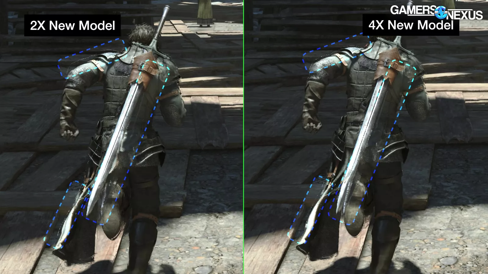NVIDIA has got to stop lying. This isn’t just marketing, this is an actual, verifiable lie. But let’s just pretend MFG 4X is somehow a fair comparison against the 4090 in a scenario that’s maybe not VRAM constrained. It’s an OK technology, but it is not a like-for-like comparison because the images themselves are not the same. When you turn it on, it’s like Clive here has 6 feet.