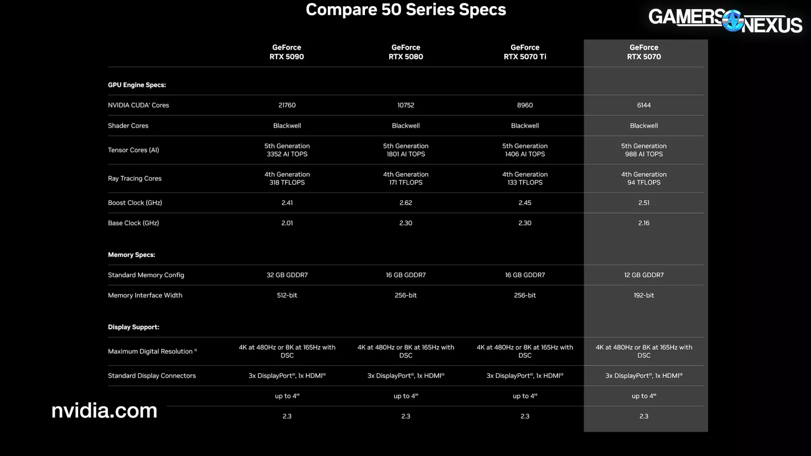 The RTX 5070 GPU has an advertised 6144 CUDA cores, a 192-bit bus, and 12GB of GDDR7 memory. It might even have all of its ROPs. The 5070 Ti has an MSRP at $750 and carries 16 GB of GDDR7 memory on a 256-bit bus, so there’s more bandwidth, a little more capacity, and an increase to 8960 CUDA cores, and it may even have all of the ROPs that you’re paying for.