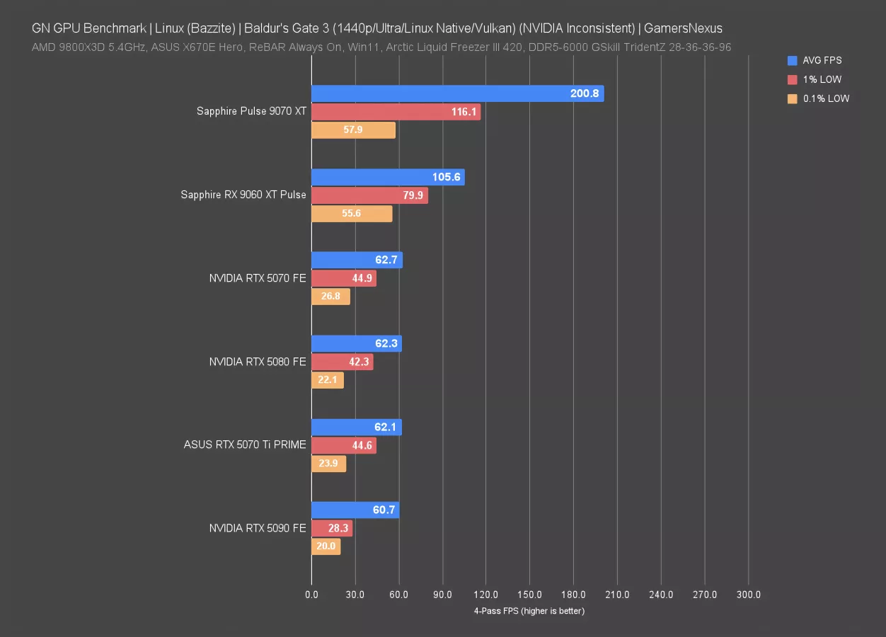 At 1080p and with the Linux native build running the Vulkan API, NVIDIA runs completely sporadically and unreliably. We’re well aware that the 5090 is below the 5070, and that obviously this is not how these cards actually behave. After re-tests and evaluations though, the only thing consistent is inconsistency when it comes to NVIDIA with the Linux native build of Baldur’s Gate 3 with Vulkan.