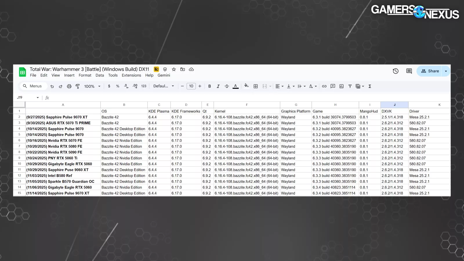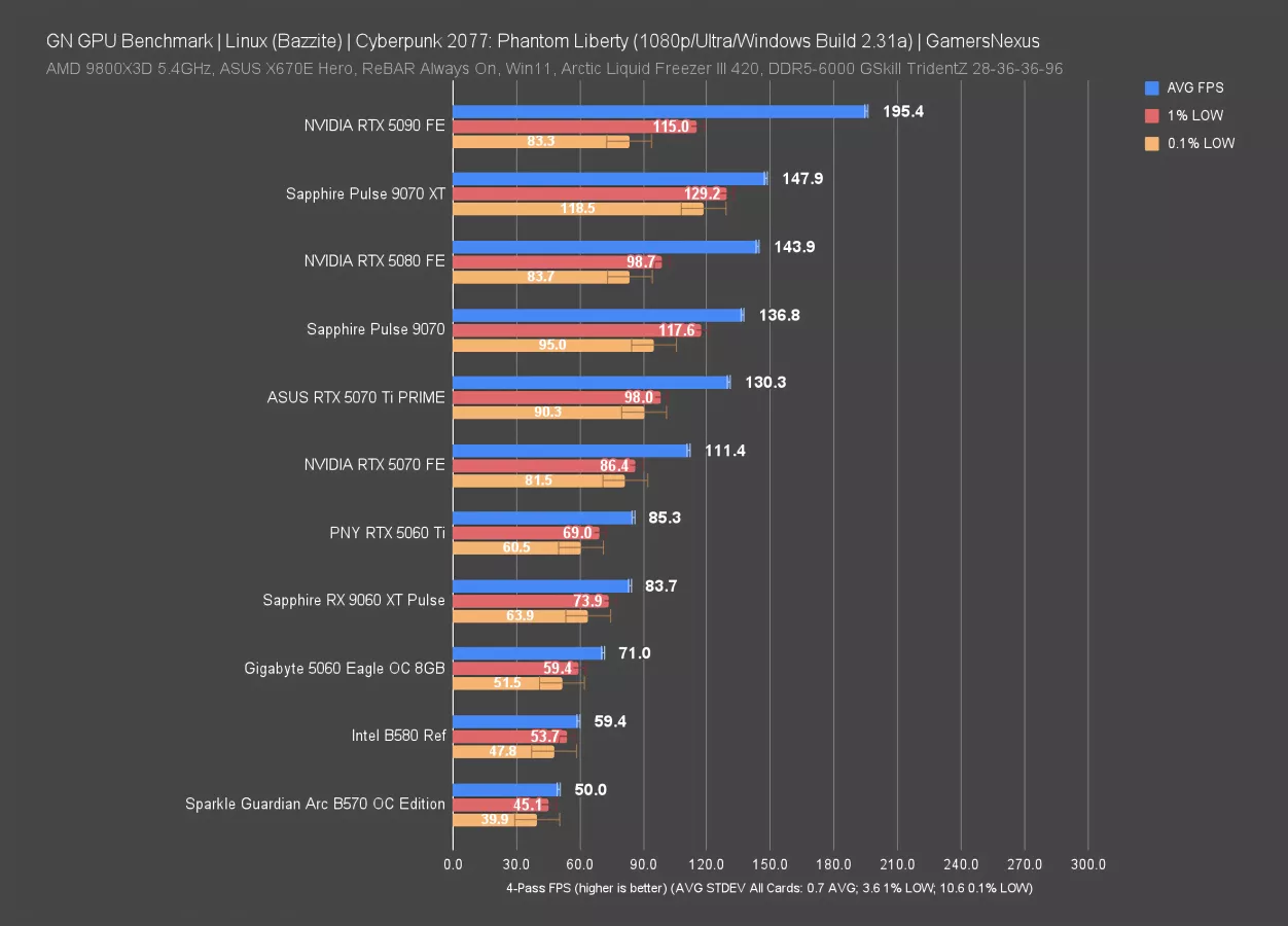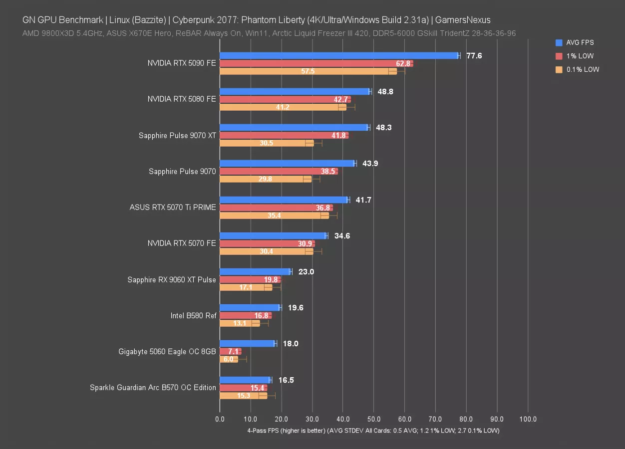 It's been a lot of work, but we have some initial GPU results for Linux, specifically for the Bazzite distribution. The testing was about 3 weeks of nonstop work, plus about 2-3 weeks of bench setup and “bench hygiene” management. We’re still learning. Benchmarking anything to the level of isolation we maintain requires a lot of controls and experience, so you’ll have to work with us while we learn these processes.