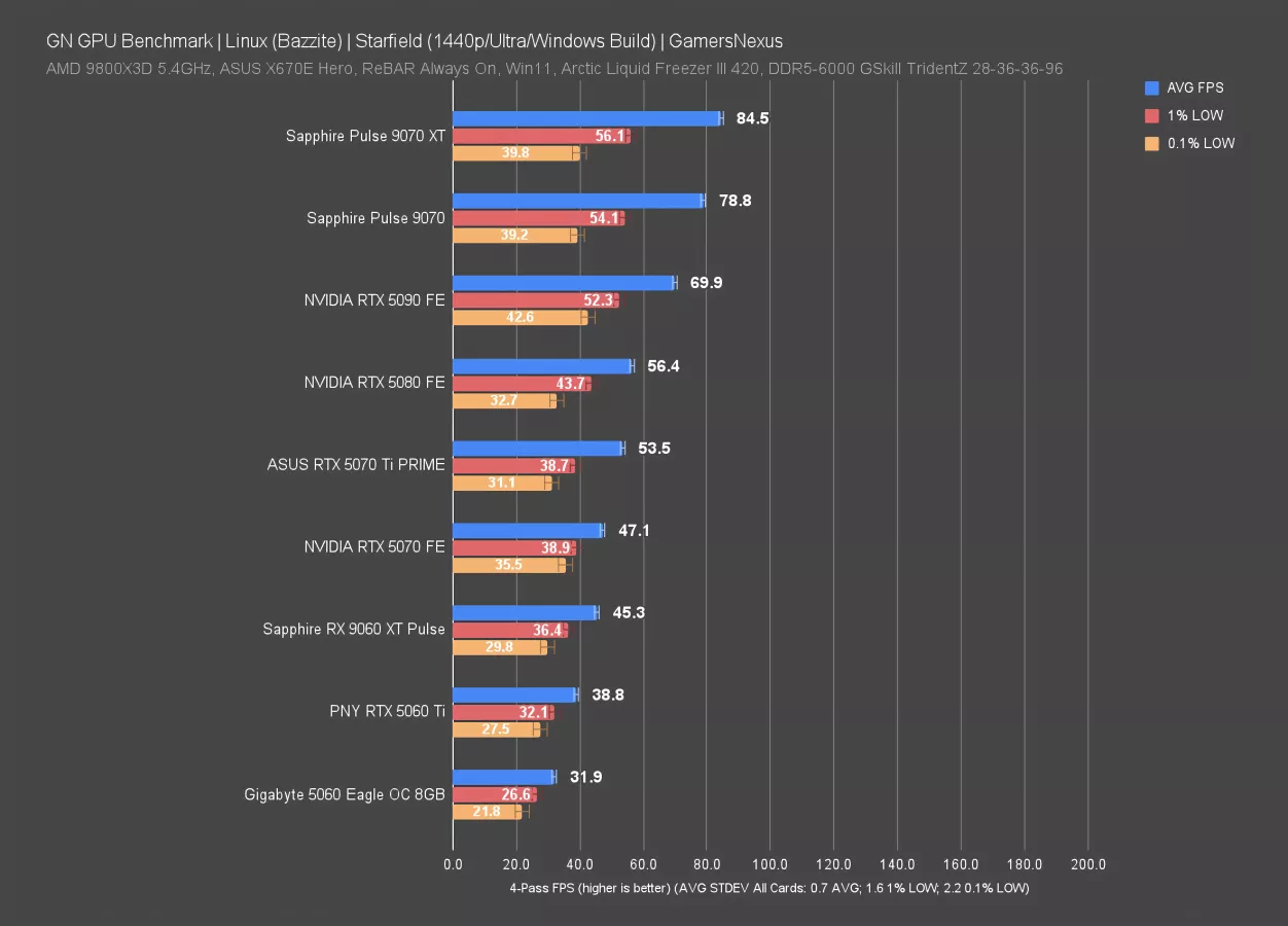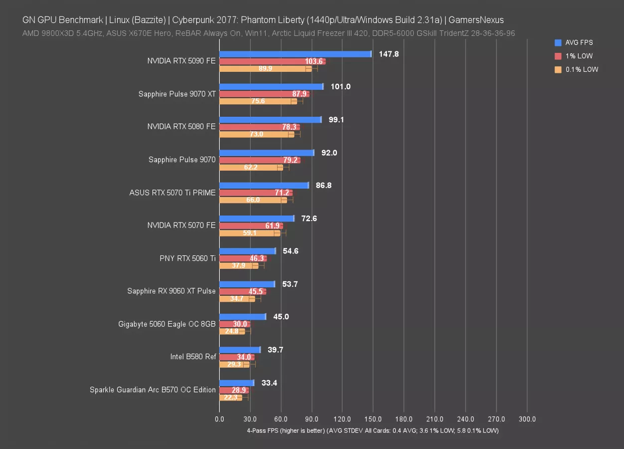 The 5090 (read our review) leads the chart for 1080p at 176 FPS AVG. Just like with Windows, we’ll need to look to higher resolutions to ensure it’s not CPU-bound. The 9070 XT is disturbingly close for NVIDIA, up at 140 FPS AVG and leading the RTX 5080’s 134 FPS result by 3.9%. Lows are about the same between them. The 5070 Ti suffers somewhat in 0.1% lows. On inspection, it had one pass with a 23 FPS 0.1% low, one with 61, and two at 96-97 FPS. The GPU experienced more variance than typical.