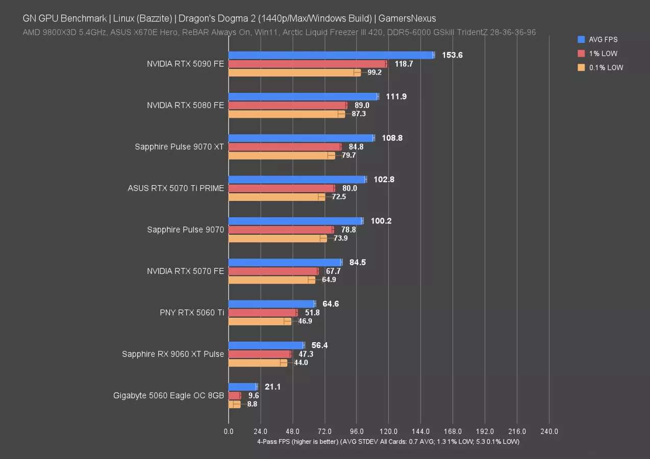 We’ll start with the Windows build of Dragon’s Dogma 2 at 1080p/Max settings. For this testing, we used KDE Plasma 6.4.4, KDE Framework 6.17.0, Qt 6.9.2, Wayland, and 10.0-2e Proton, except the 9070 XT (read our review) and 5070 Ti (read our review), which ran earlier and were both experimental 10.0-20250919.