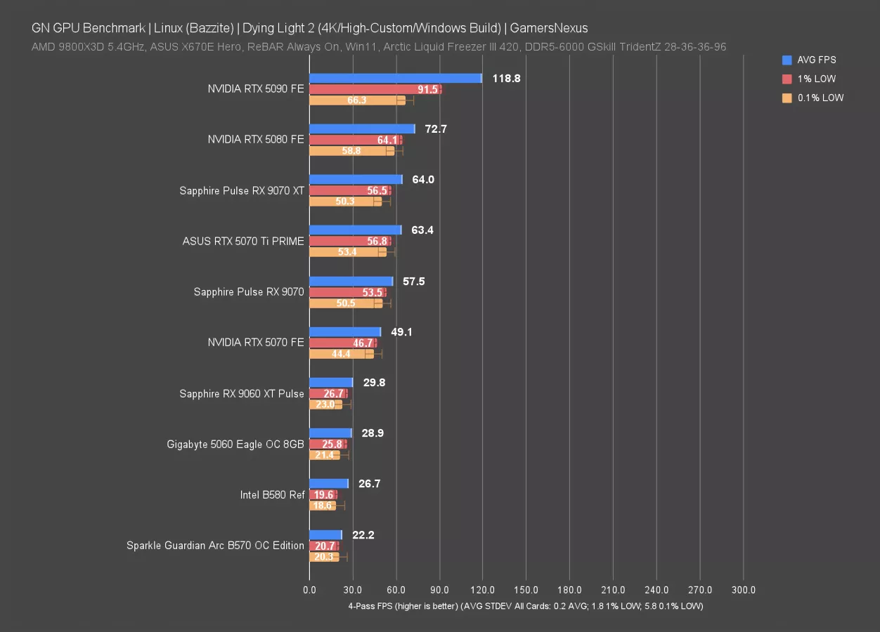 The 5090 held a 135 FPS AVG, leading the 5080 by 46%. The 5070 Ti follows, with the 9070 XT showing up at 72 FPS AVG and landing between the 5070 and 5070 Ti. Intel’s B580 actually did well here with its 58 FPS AVG, planting it just ahead of the 5060 Ti. That’s a compelling argument for Intel.