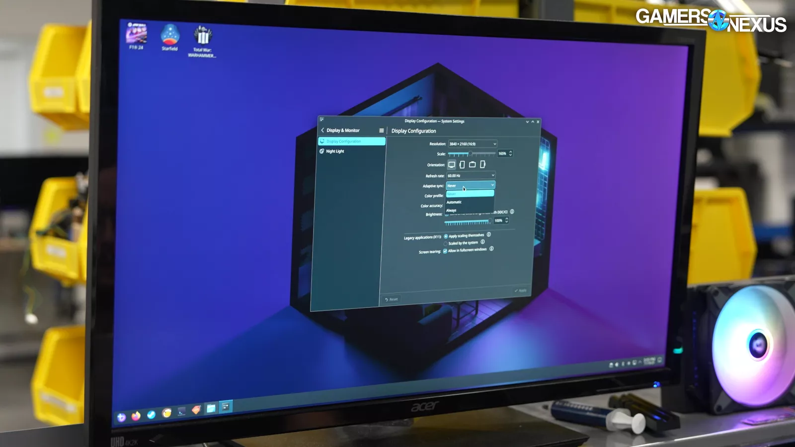 To cover the equivalent settings that we'd change on Windows, we set "Adaptive Sync" to Never, allowed screen tearing for fullscreen windows, and set the power profile to Performance. We've had warnings from Wendell and others about kernel spinlock performance loss, the CPU performance governor, and plenty of other Linux-y things, but the advantage of a plug-and-play OS like Bazzite is that we can just install it and run it. Any issues are a valid part of the experience.