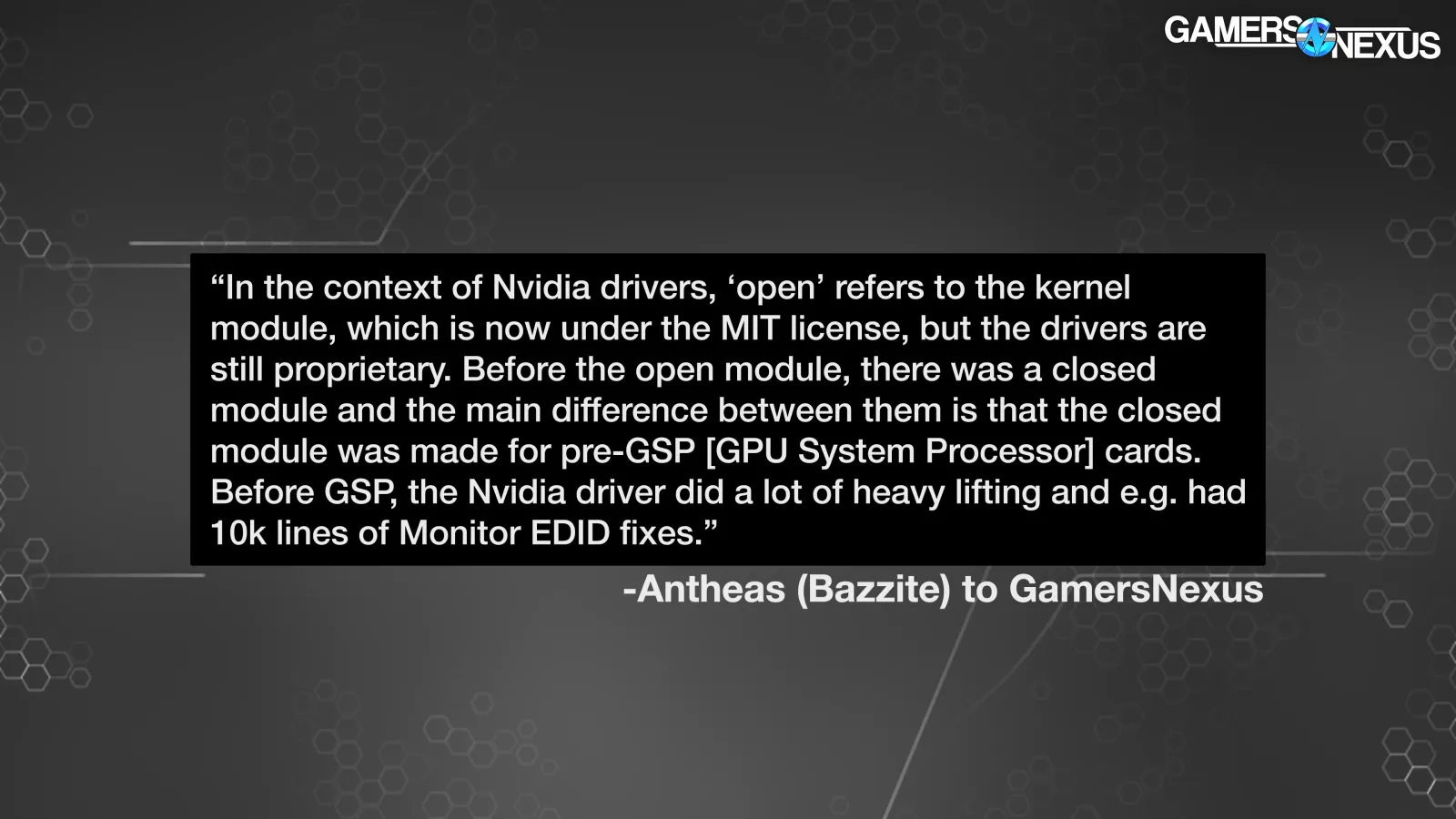 From Antheas again: "In the context of NVIDIA drivers, ‘open’ refers to the kernel module, which is now under the MIT license, but the drivers are still proprietary. Before the open module, there was a closed module and the main difference between them is that the closed module was made for pre-GSP [GPU System Processor] cards. Before GSP, the NVIDIA driver did a lot of heavy lifting and e.g. had 10k lines of Monitor EDID fixes.”