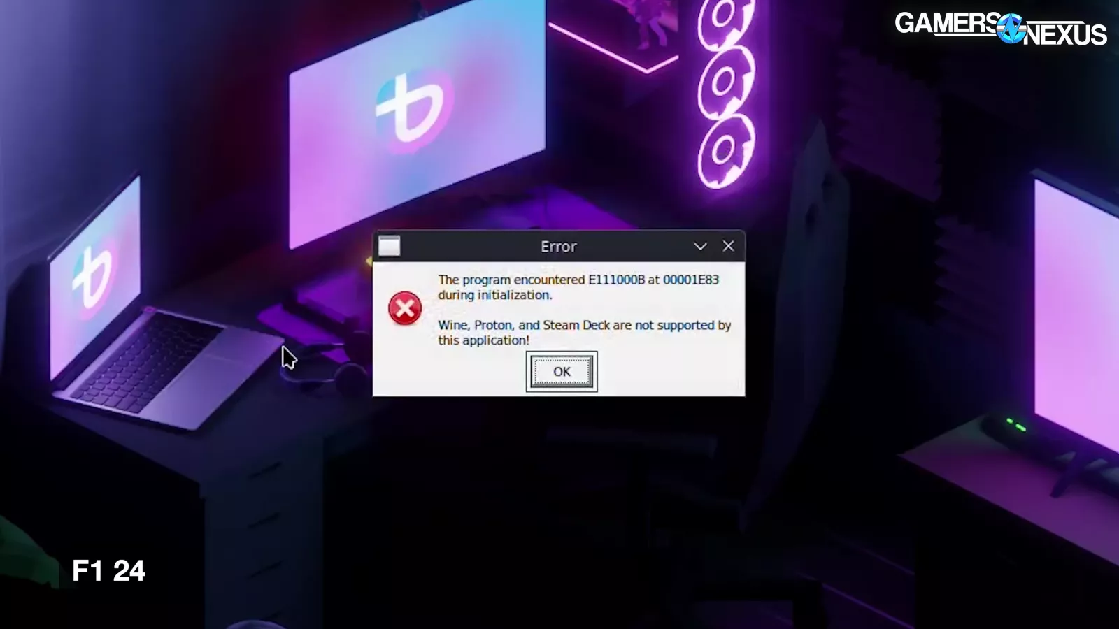 As Steam Deck users are aware, some anticheat software flat out refuses to run, which means games can refuse to run. We dropped F1 24 immediately for this reason. This is the only game from our suite that was affected, but since anti-cheat is usually associated with popular mainstream games, this remains one of the most significant obstacles to Linux gaming.