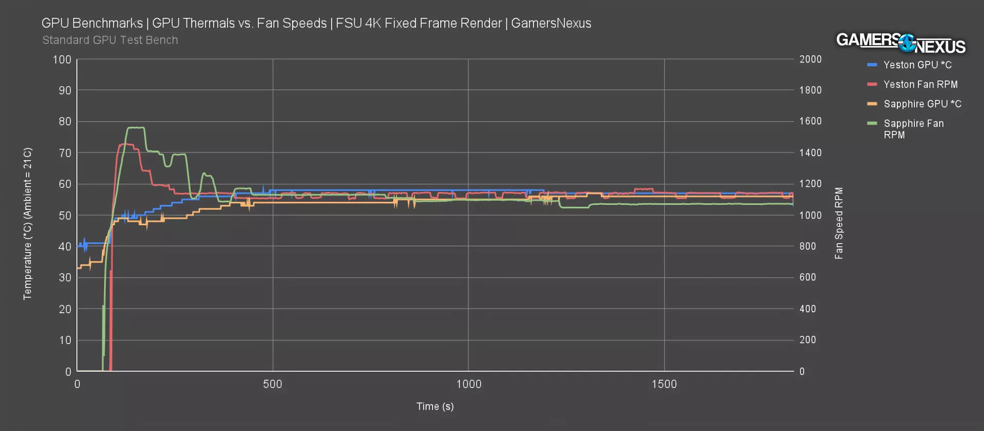 We’re looking at just the steady state fan speed here. Here’s the plot of the Yeston RX 9070 XT Atlantis card against the Sapphire Pulse that we reviewed. Both are shown represented by their fan speeds they ran during thermal benchmarking at steady state.