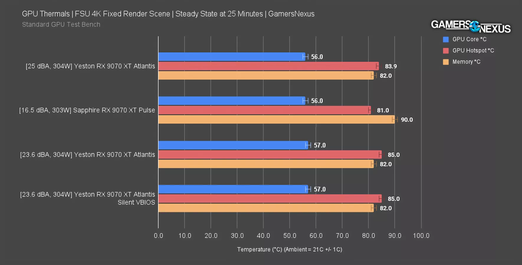 So far, the two cards are hitting the same GPU edge temperature at 56 degrees Celsius when in a controlled ambient of +/- 1* C from 21 C. The coolers achieve the same performance on the GPU core. Hot spot temperature is relatively high on both, but not yet untenable on the Yeston card: It’s at 85 degrees when left to run at its auto settings, or 84 with our noise-normalized target that we’re beginning to collect data for. We haven’t run the Pulse XT at this target yet.