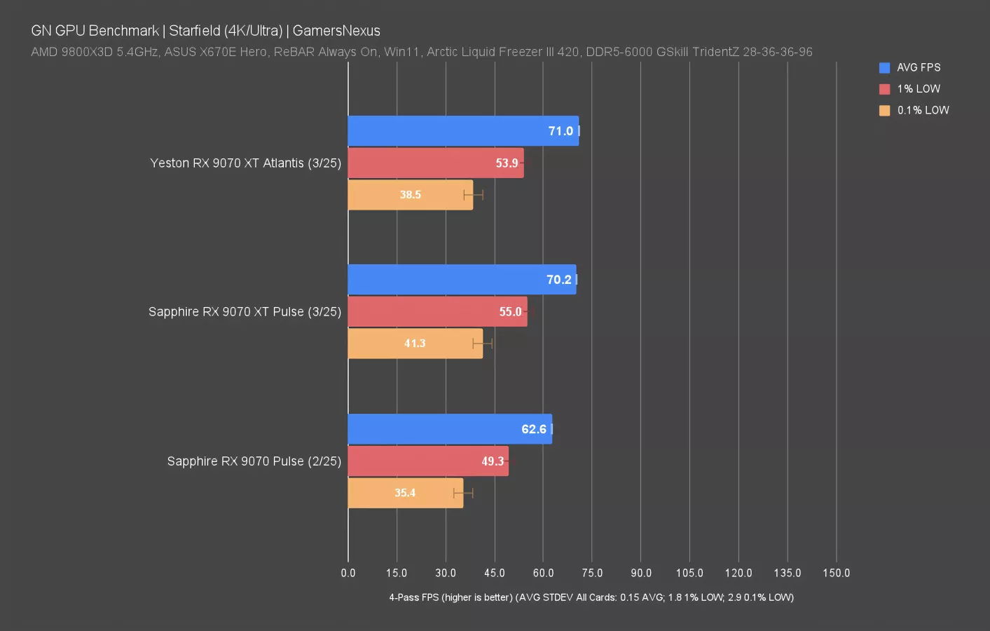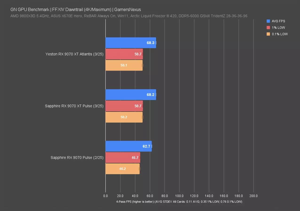 Final Fantasy at 4K has the two 9070 XTs we’ve tested as nearly perfectly identical. But of course, the most adept gamers among you will identify the 0.1 FPS AVG difference.