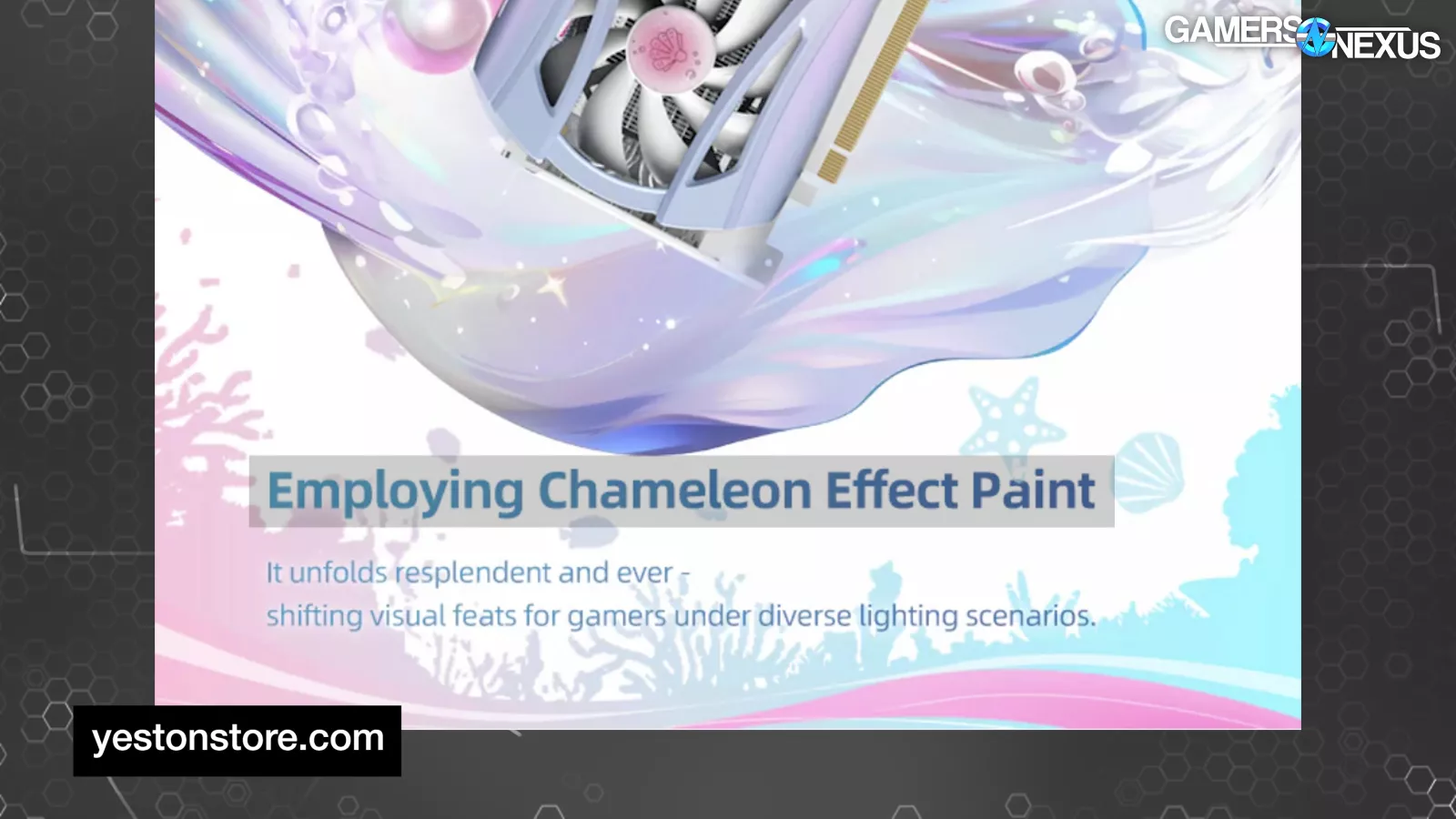 Yeston’s marketing says it employs “chameleon effect paint” that “unfolds resplendent and ever-shifting visual feats for gamers under diverse lighting scenarios,” which, credit to them, is like the inverse of PowerColor’s prologue about hellstones and dark obelisks.