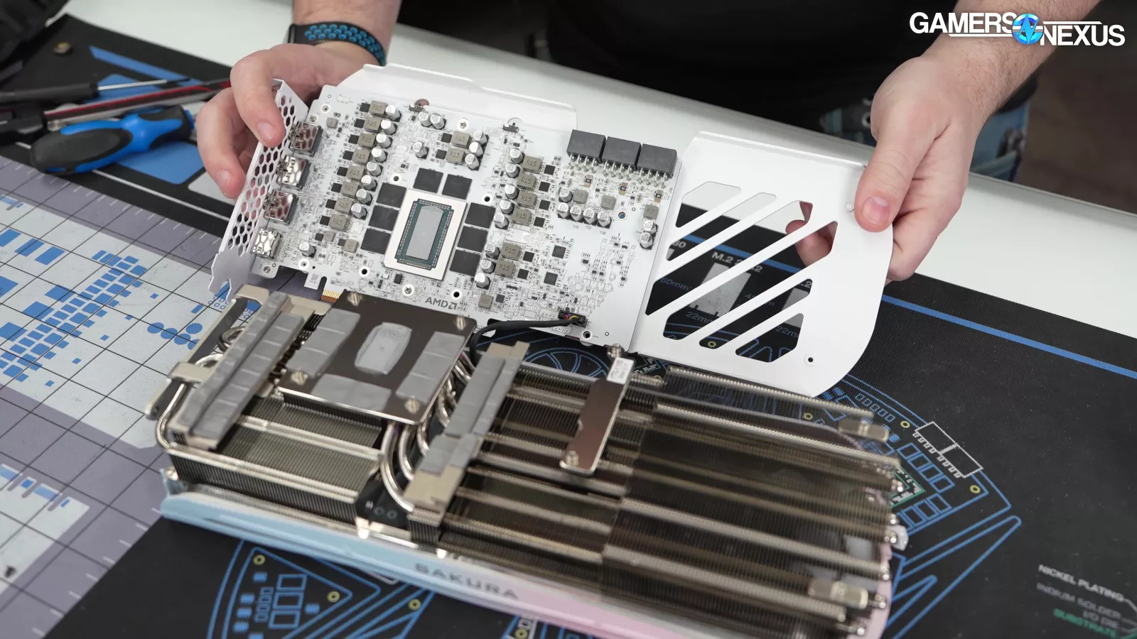The new RX 9070 XT Atlantis we’re reviewing, despite being called “Atlantis,” isn’t water-cooled. It uses 3 fans and a modestly sized finstack.