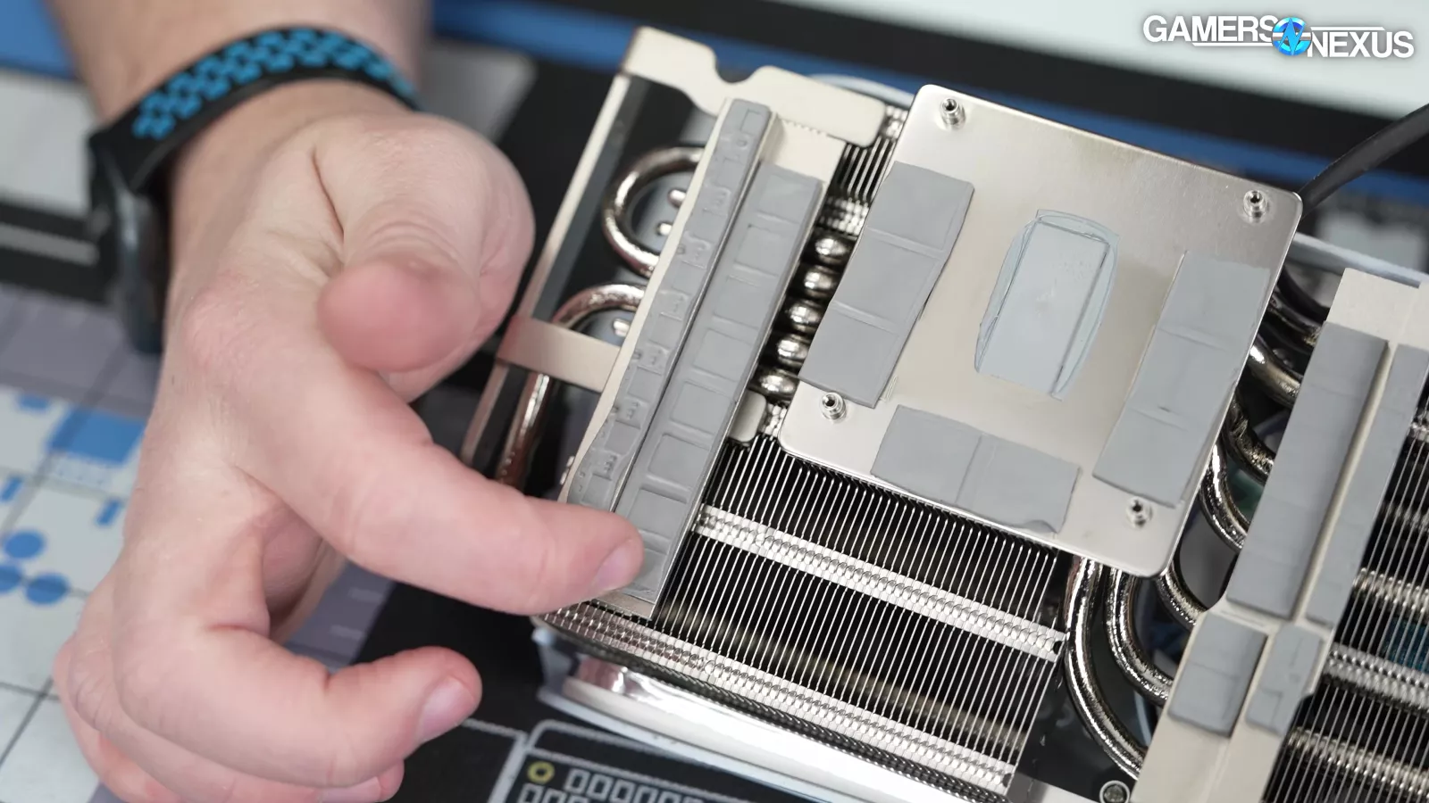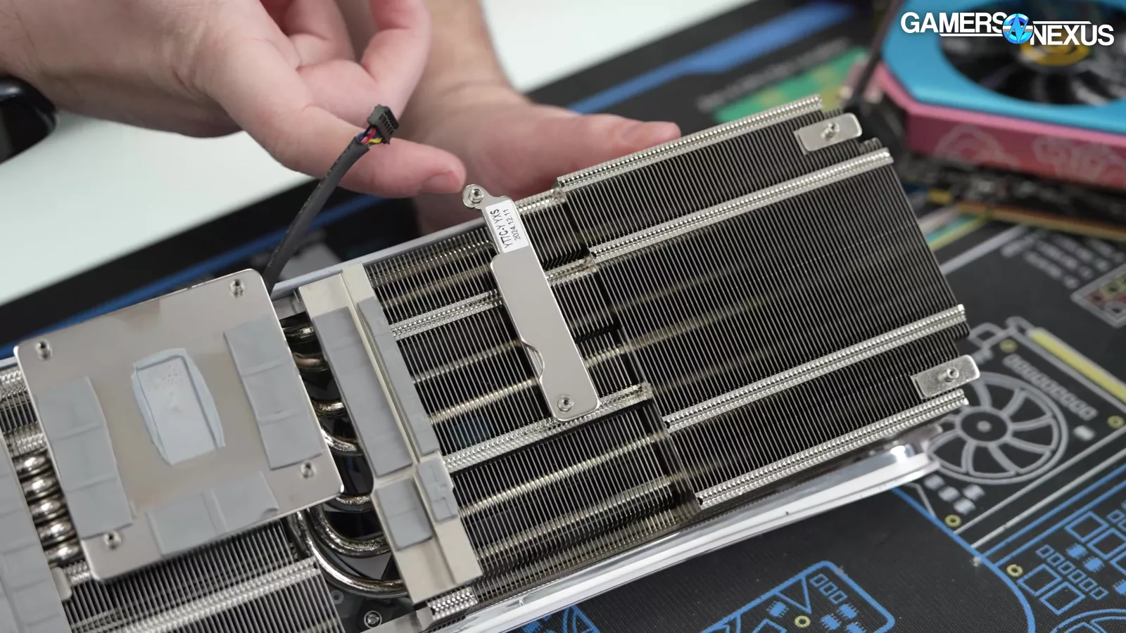 Removing the cooler from the card, the contact patch looks to use a phase-change pad. The memory uses 3 pads, which are on the nickel-plated copper cold plate. This means the GPU and memory use the same cold plate.