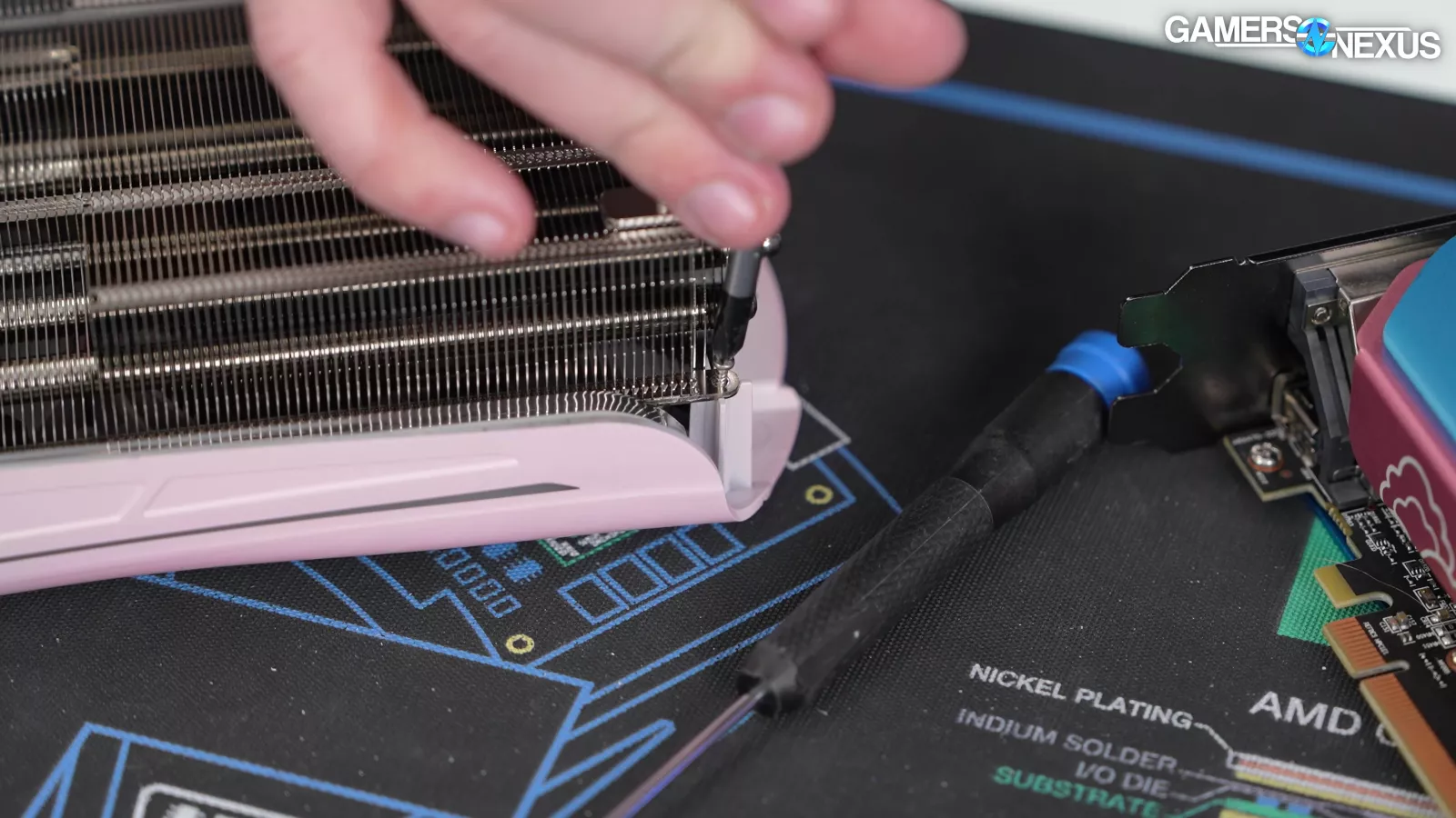 To release the shroud from the fin stack, we had to remove 4 screws. One of the screws featured a cut-out to accommodate a screw driver, which is a nice design.