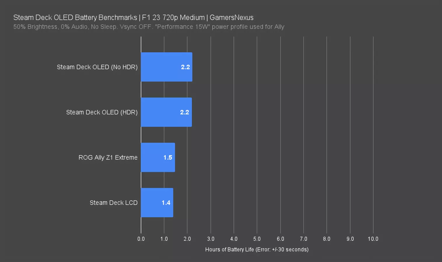 Battery life is completely dependent on workload. We've used three in the past for handhelds: VLC looping a 4K video locally, Dead Cells with a framerate cap, and F1 22 with unlimited framerate. This time around, we subbed in F1 23 to fix some crashing problems with the OLED. We wanted to add some full brightness tests as well, but even using F1 23, we found that the game would reliably crash if the OLED was set to 100% brightness; as a result, we only have 50% brightness comparisons here. We couldn’t find a solution to this bug and it did not appear to be related to thermals.