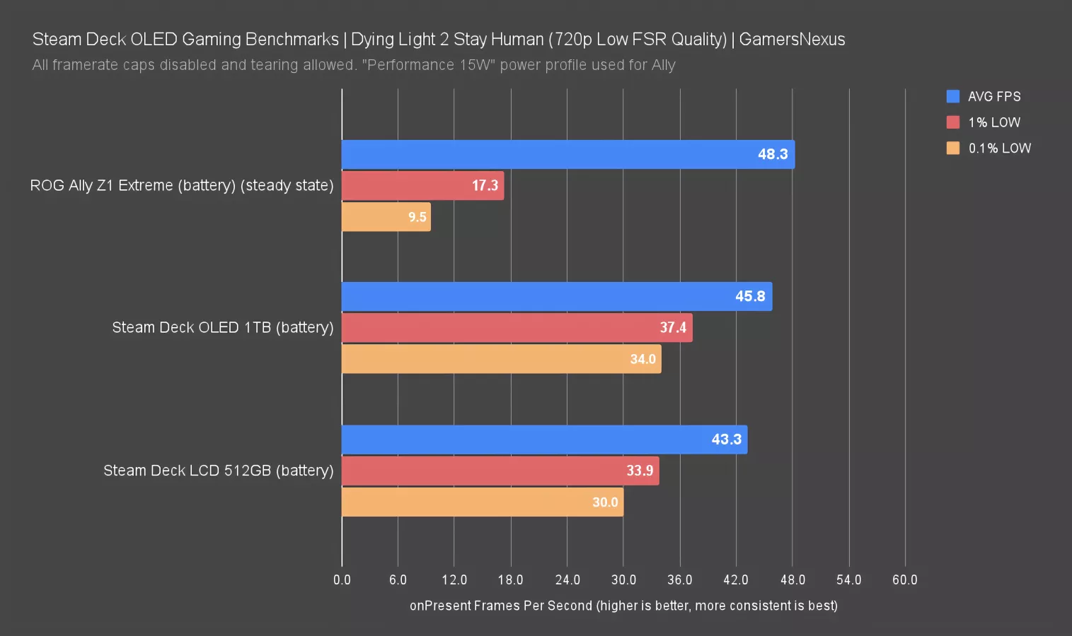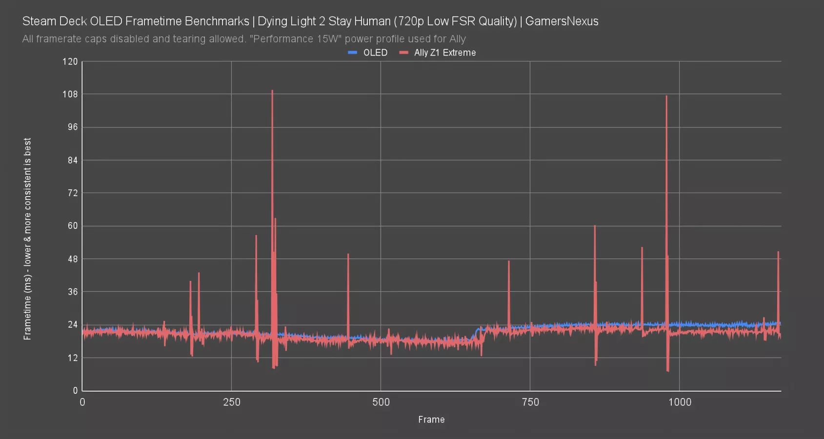 For Dying Light 2, we opted to set FSR to Quality and push the settings down to the Low preset to hit playable framerates. The OLED had a lead over the original again, with a similar 6% uplift to 45.8FPS AVG. The Ally Z1 Extreme's average may have been higher (at 48FPS), but the lows are terrible, which is something we noted in our original review. We’ve proven this uncountable times over the last 12 years, but this is, once again, why it’s so important to look beyond average. The frametime pacing wasn’t good here, and the difference in OS and the drivers used on each is a large part of that. Despite an AVG FPS advantage for the Ally, the Deck provides a significantly better experience. Let’s look closer.