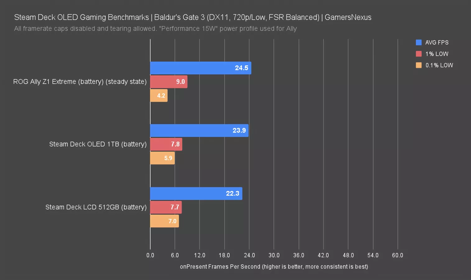 The lows are abysmal on the crowded city street we use for testing, even at 720p Low with FSR 2.2 dropped all the way down to Balanced. 22.3FPS average on the LCD with 7.0 for 0.1% lows is brutal from the perspective of a desktop gamer, but Baldur's Gate 3 doesn't require high framerates to be playable, and there are plenty of players who will testify to that. The OLED improves things as much here as anywhere else, up 7% from the LCD, but that only translates to a 23.9FPS average with the unpleasant frametime spikes unchanged. The Ally did even better, and although it had poor 0.1% lows overall, it had high run-to-run variance with some individual stable passes mixed in.