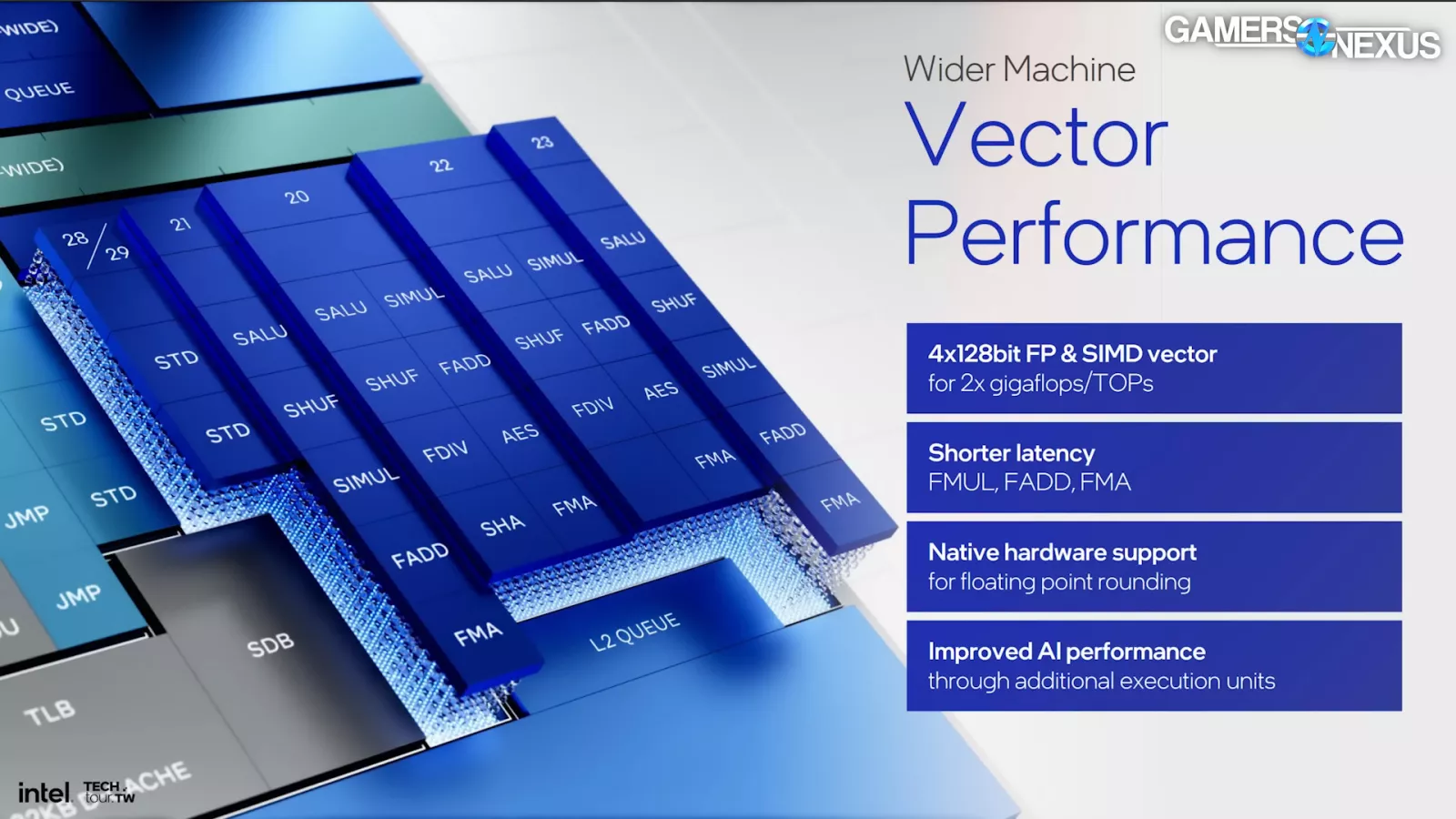 The updates to the individual cores themselves are similar to the changes to P-cores. Instruction caches are larger and queues are deeper. The core is much wider in general, with vector capability being roughly doubled. Intel says vector is generally the type of compute that AI leverages.