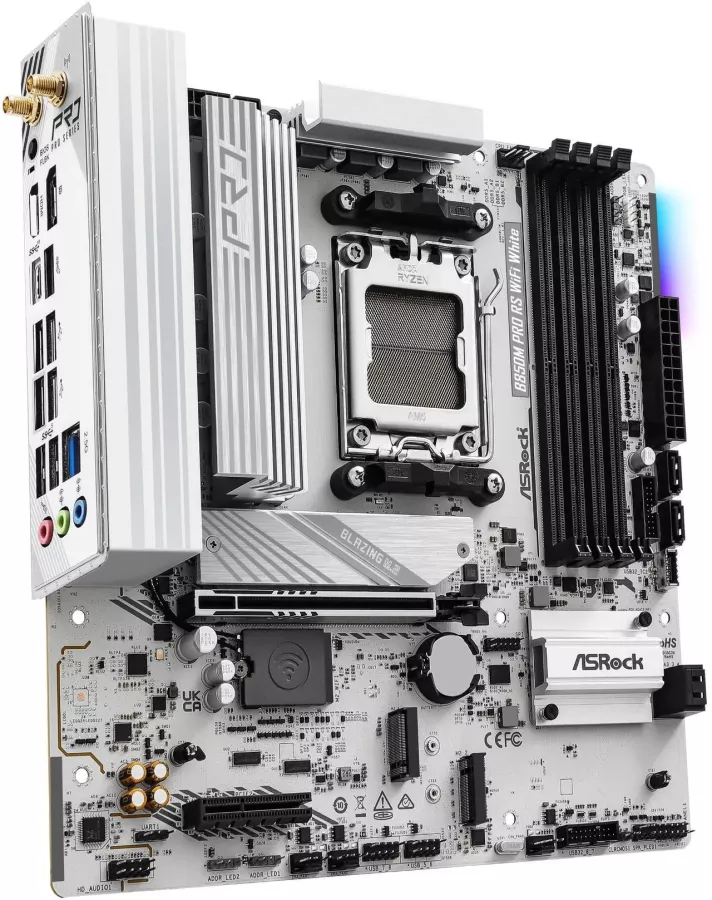 The ASRock B850M Pro RS WiFi White motherboard fits this build well. The B950M Pro RS is priced well compared to its competition at $140, and features 7x rear USB-A ports, 1x rear USB-C port, built-in Wi-Fi 6E, and support for 3x M.2 SSDs (one of which is PCIe Gen5). This motherboard also should support CPU upgrades from AMD for the foreseeable future.