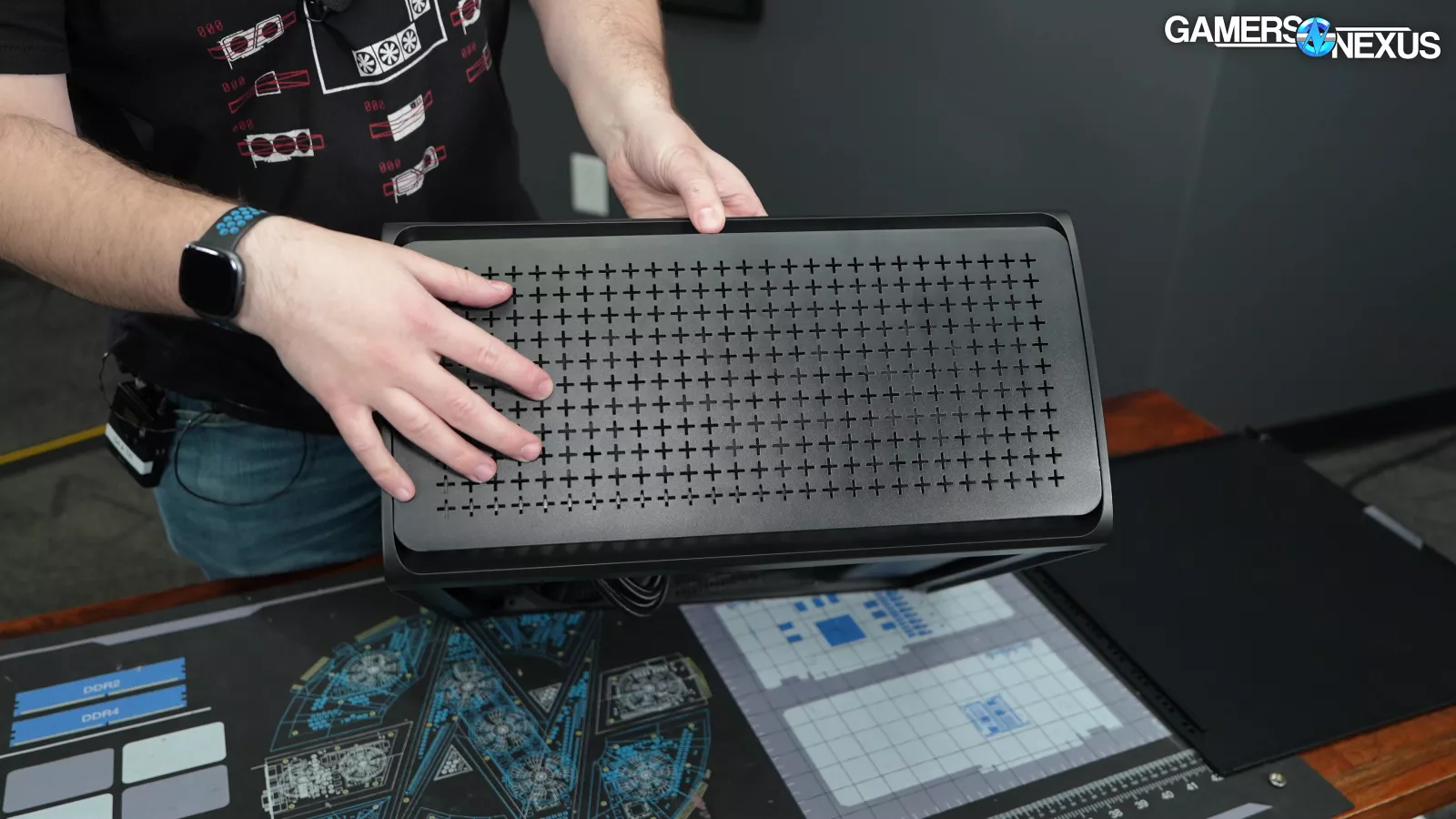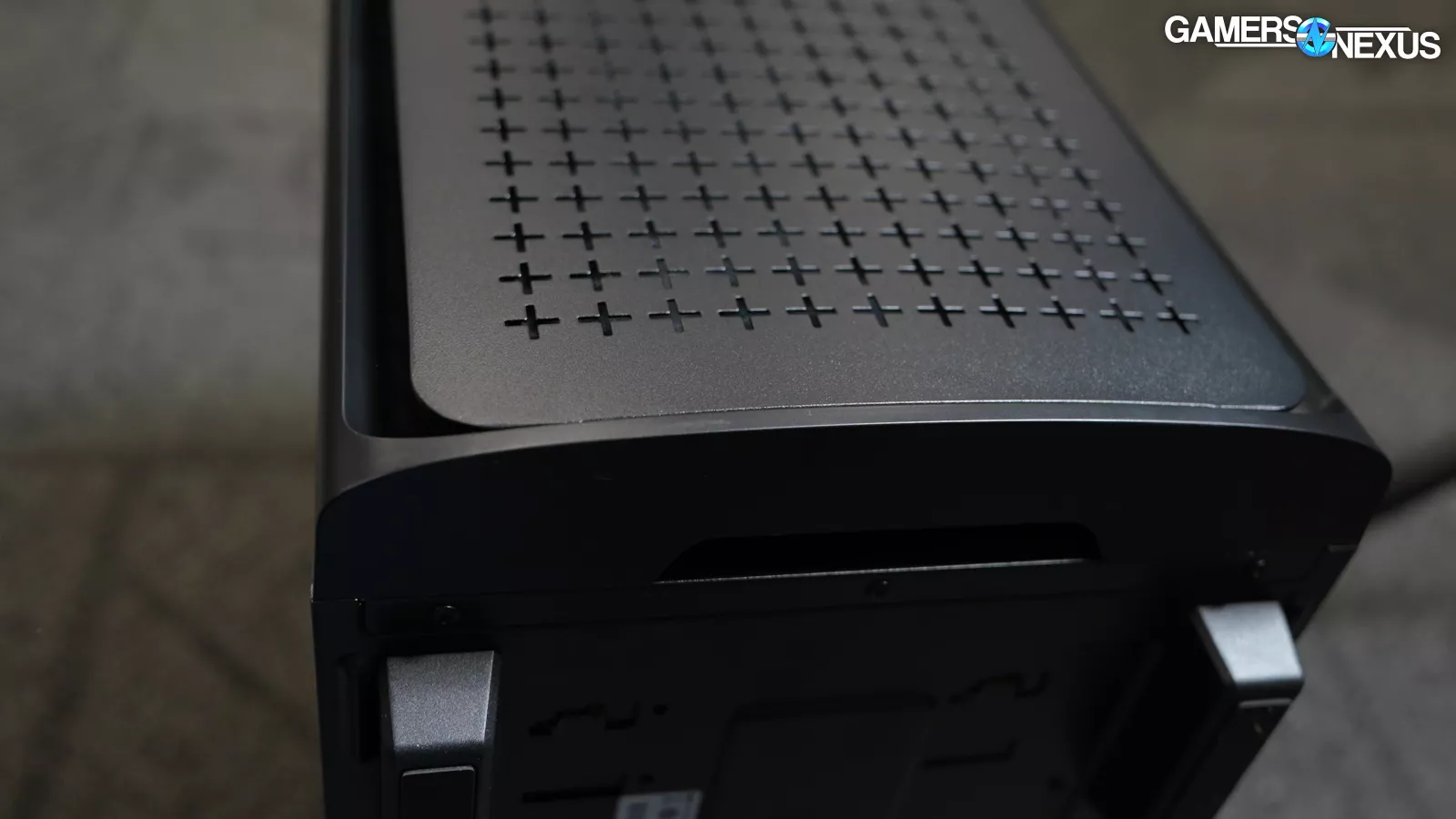 Taking a look at the front of the case again, it has some of the worst perforation achievable on a panel and doesn't offer much ventilation. The porosity is exceptionally low on the front panel, meaning high resistance to flow at air intake and more acoustic downsides. The reason it can still breathe is because of the side intake, which doesn’t have a ton of room, but is sufficient with the fan count.