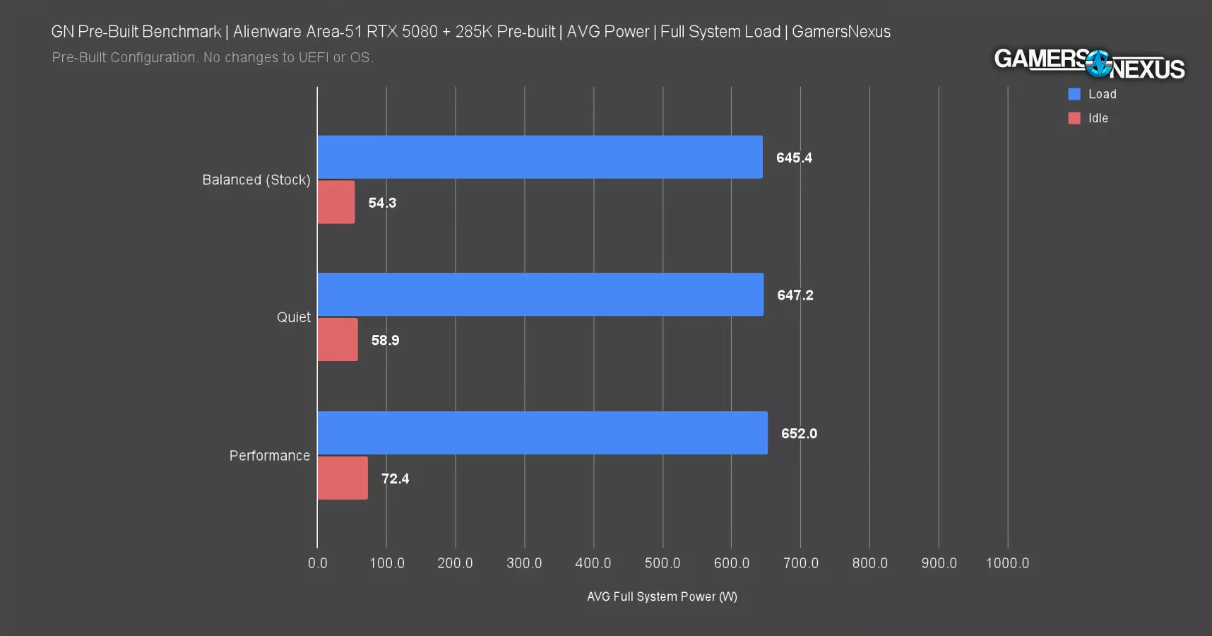 Measuring power at the wall during the full system torture load shows only marginal differences between the three profiles, all sitting around 650W average at load. The most significant difference is elevated power consumption at idle when using the Performance profile. This is due to the raised fan and pump speeds.