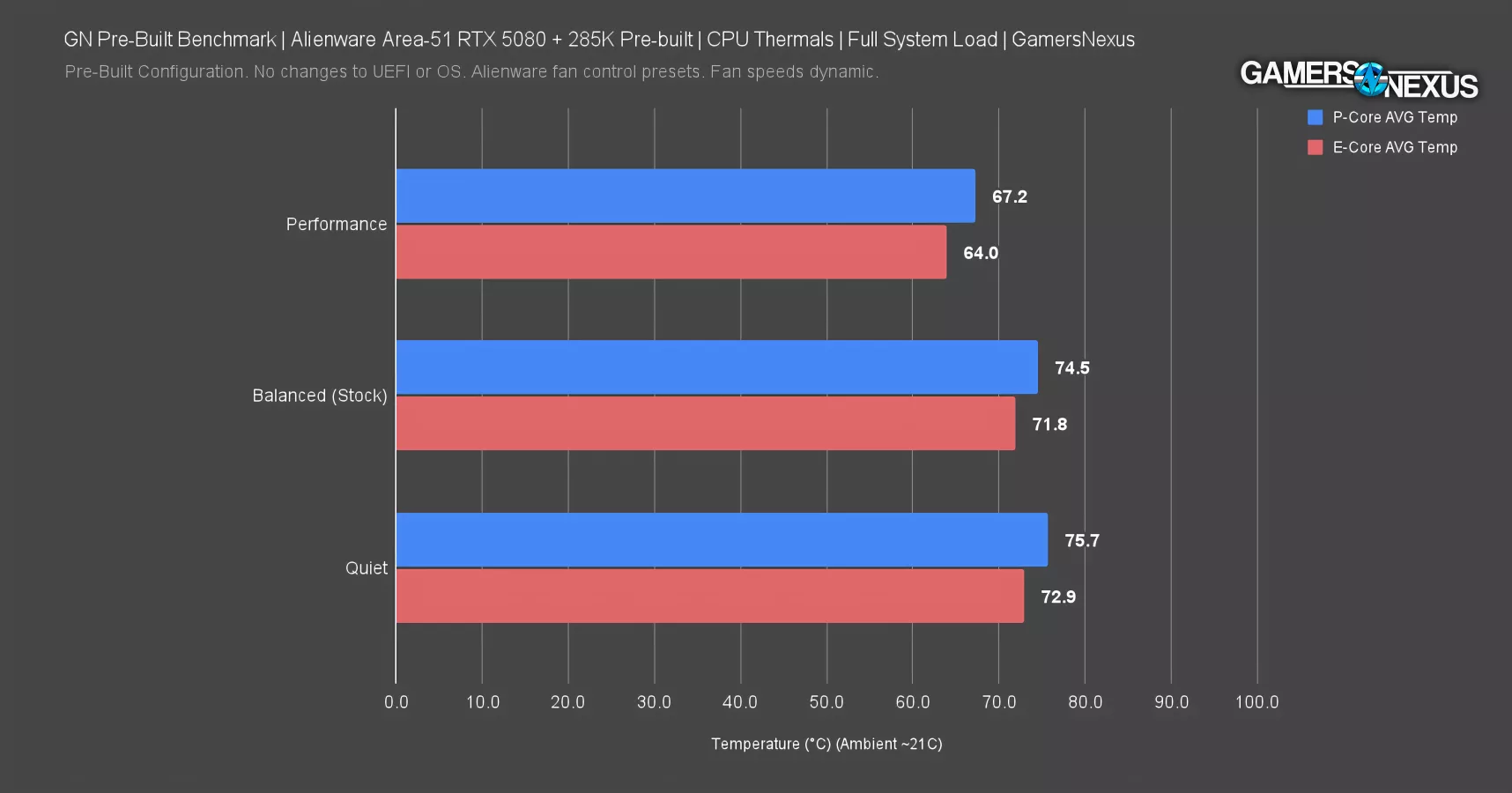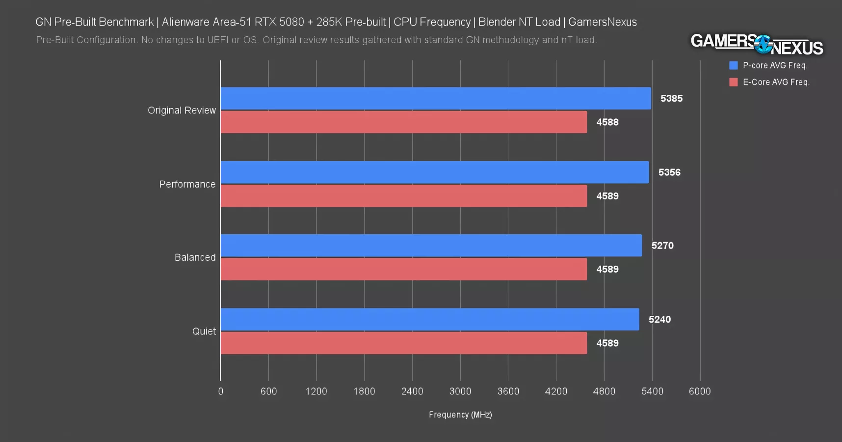 To Alienware’s credit, that’s not the case here. The Intel 285K with the 360mm liquid cooler and the fans at the Performance preset only loses an average of 29MHz across the P-cores versus our original review of the 285K. The stock Balanced preset gives up 115MHz on average, and Quiet falls behind by 145MHz versus stock. A 145MHz loss is large across all cores averaged and would be noticeable where performance is time-based, but because it’s an optional fan preset, we’re OK with it as long as users know about it. It’s trading clocks for lower noise.