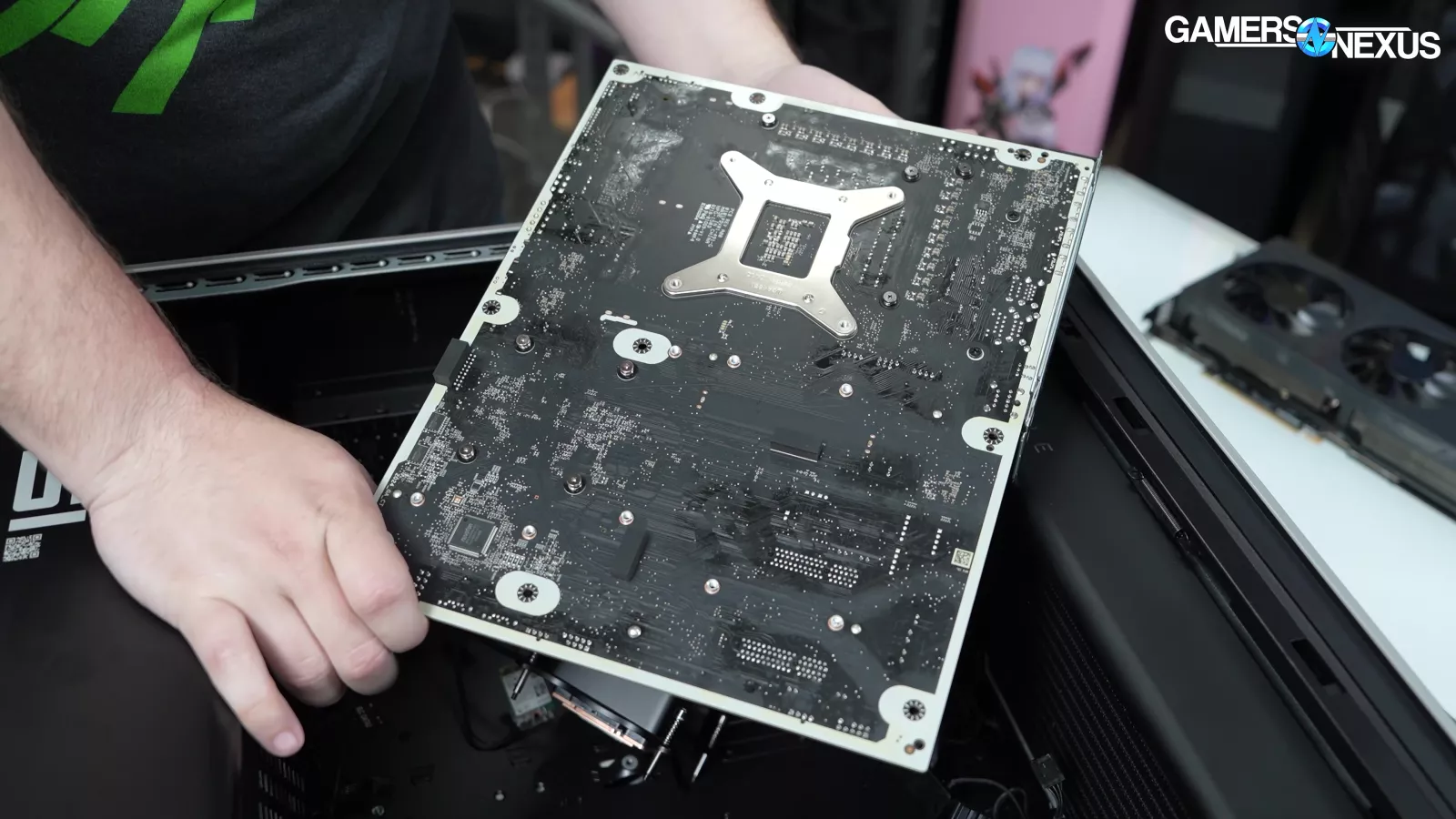 Lifitng the motherboard out of the case, we noticed that it was sticky on the back, which indicates that it wasn’t thoroughly cleaned. It shouldn’t hurt anything, but it’s kind of ugly.