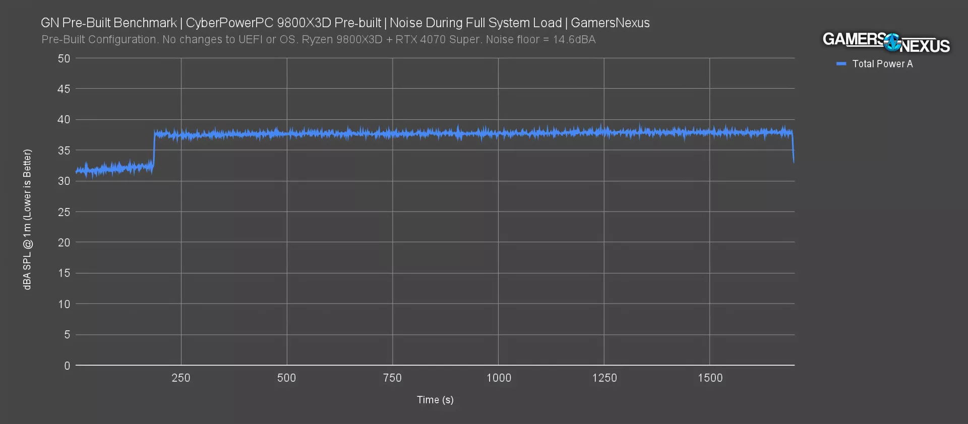 Acoustic testing in our hemi-anechoic chamber underscores the immediate fan ramp, as it instantly jumped from the idle average of 31.6dBA to 37.9dBA average under load. That’s louder than we’d like to hear at both ends of the spectrum, but is also a huge and instantaneous change and that’s the part that really matters here. There’s no gradual ramp. It just instantly dumps an extra 6 decibels of noise as soon as there’s a load, which is something an end user would notice.
