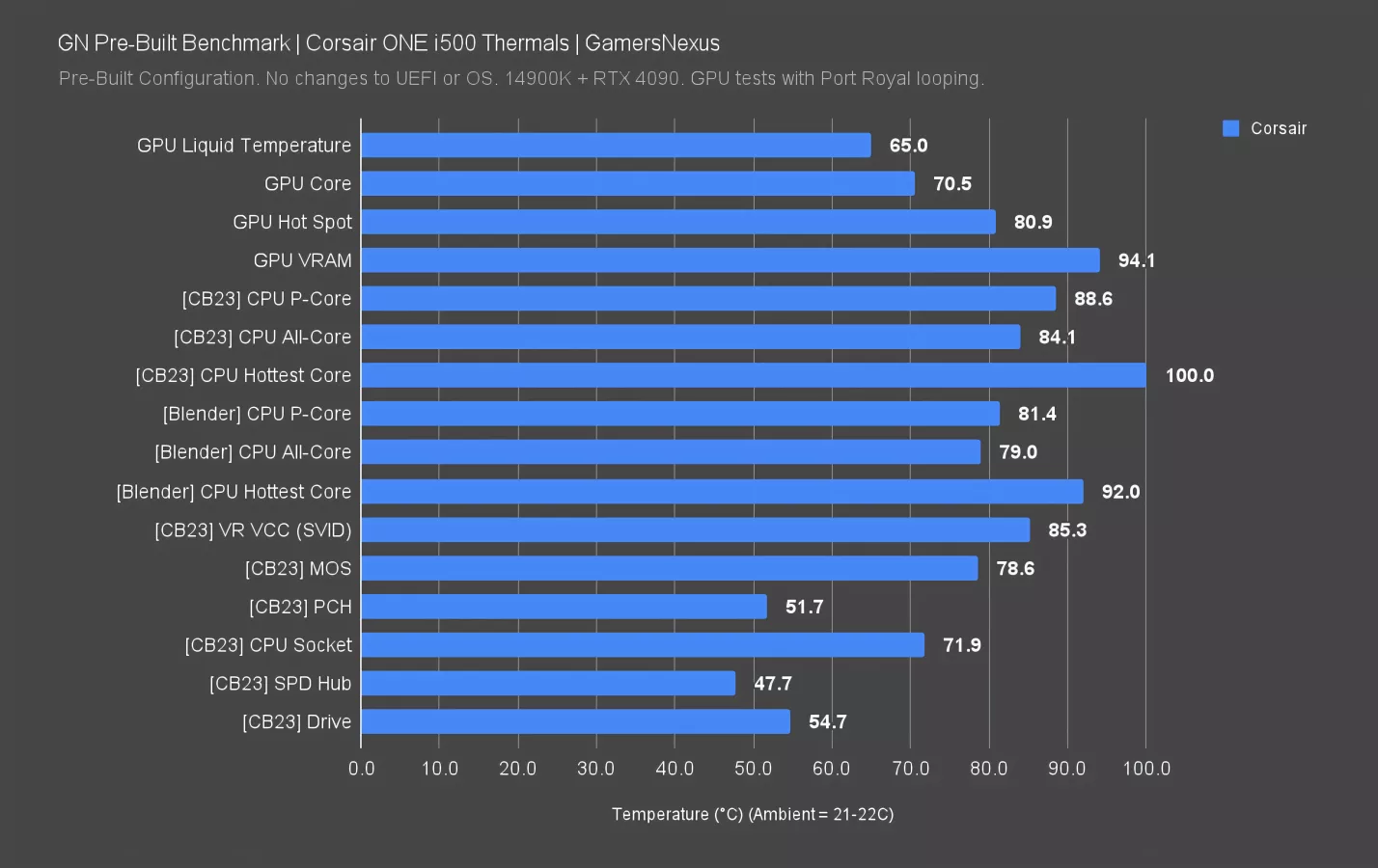 GPU thermals are abysmal. The water-cooled Corsair 4090 has GPU VRAM hitting 94 degrees Celsius in a 21C ambient, which is completely unacceptable even if it were air-cooled. TjMax for VRAM, depending on special exclusions and exceptions, is typically 95C or 105C. It depends on the specific memory. In either scenario, the 94C result is deeply concerning and embarrassing for Corsair to even ship out the door with water attached to the block that shares a cold plate with the memory.