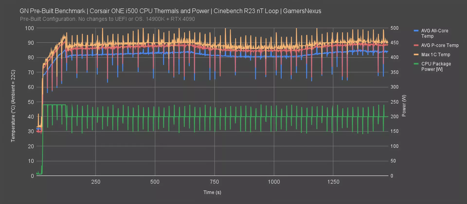 The CPU is next: During a Cinebench workload at steady-state, the P-cores averaged 89 degrees Celsius. The hottest single cores were hitting 100C, only stopping there because they were thermal throttling and hitting TjMax. This is literally compromise, again, despite what we believe is Corsair’s false advertising.