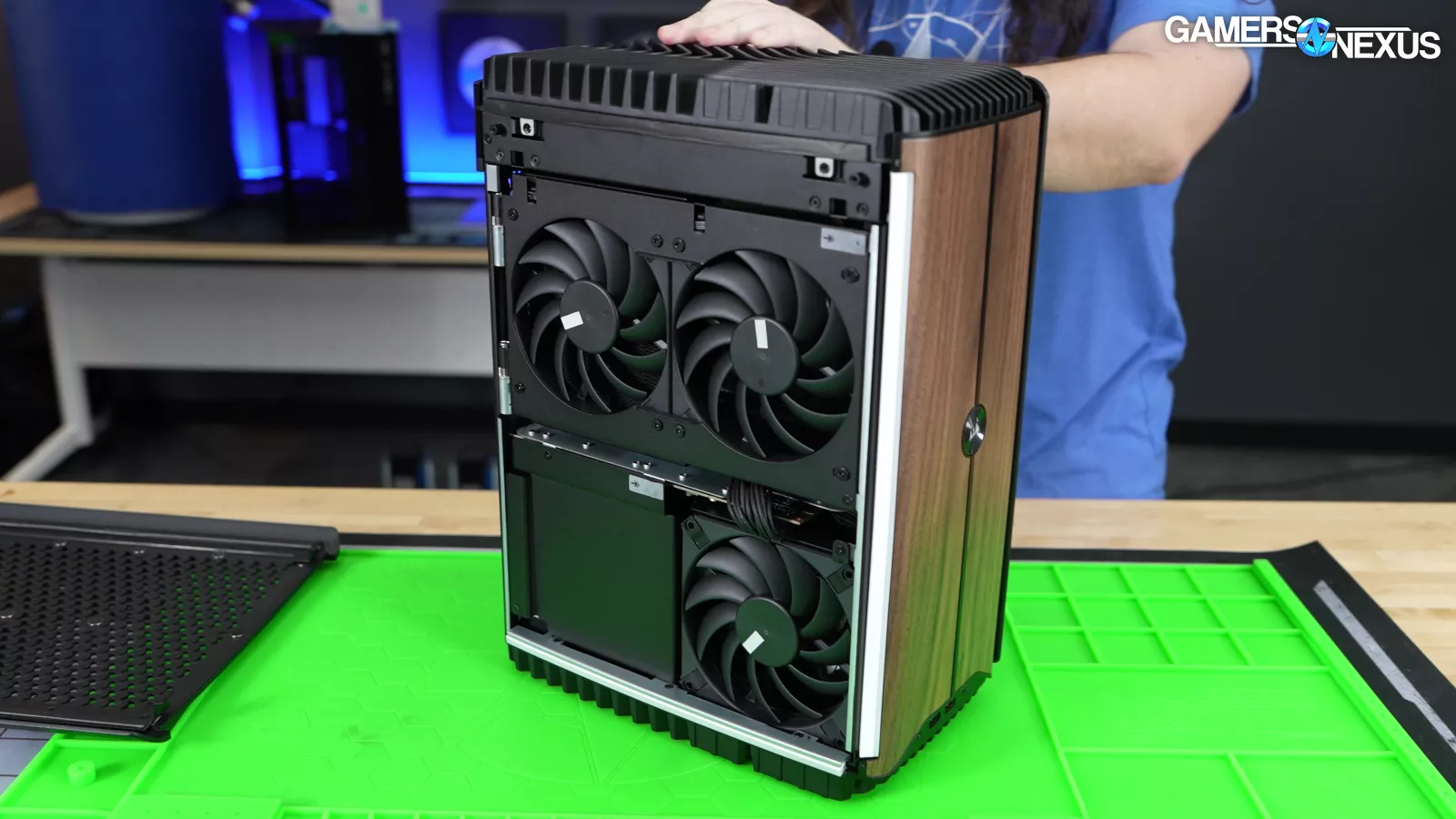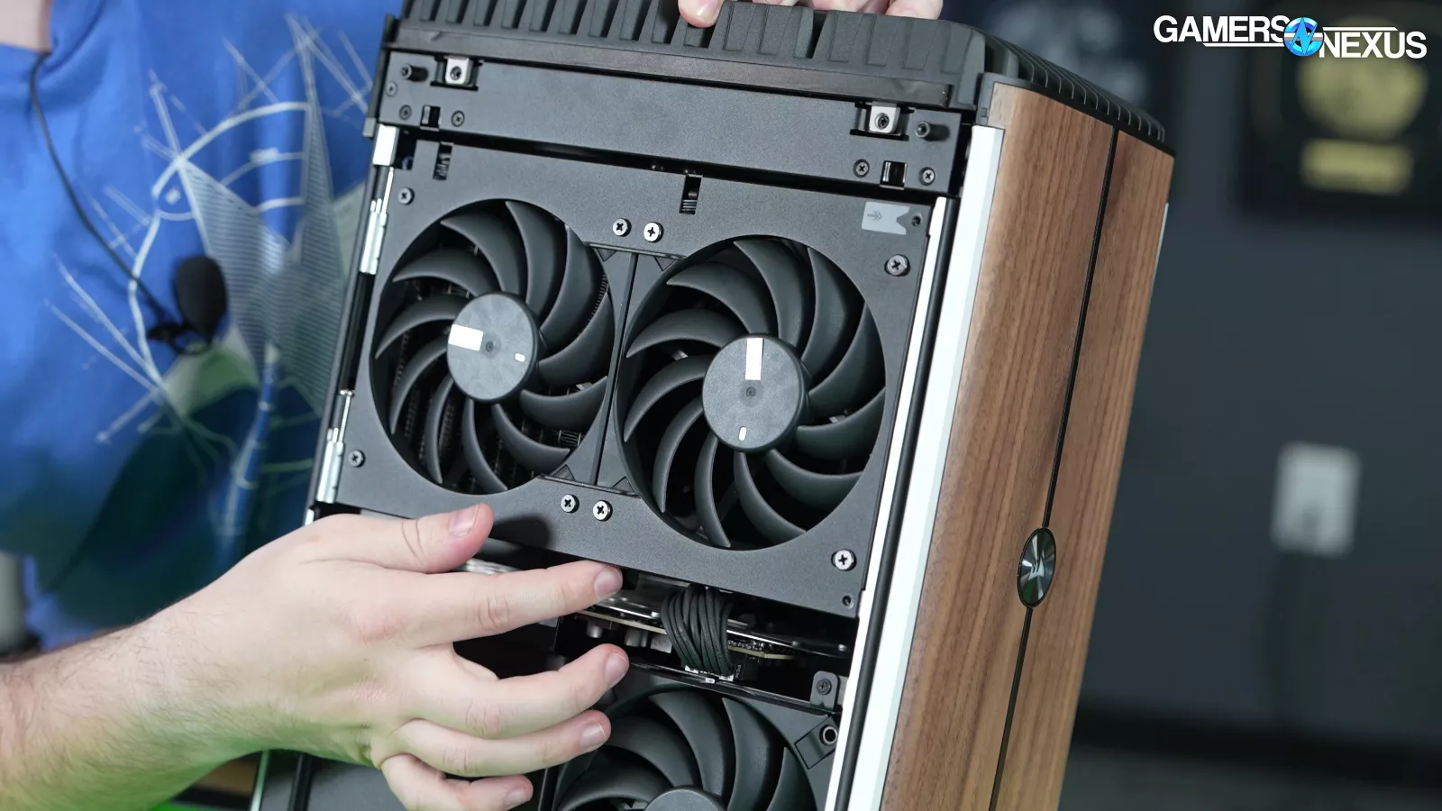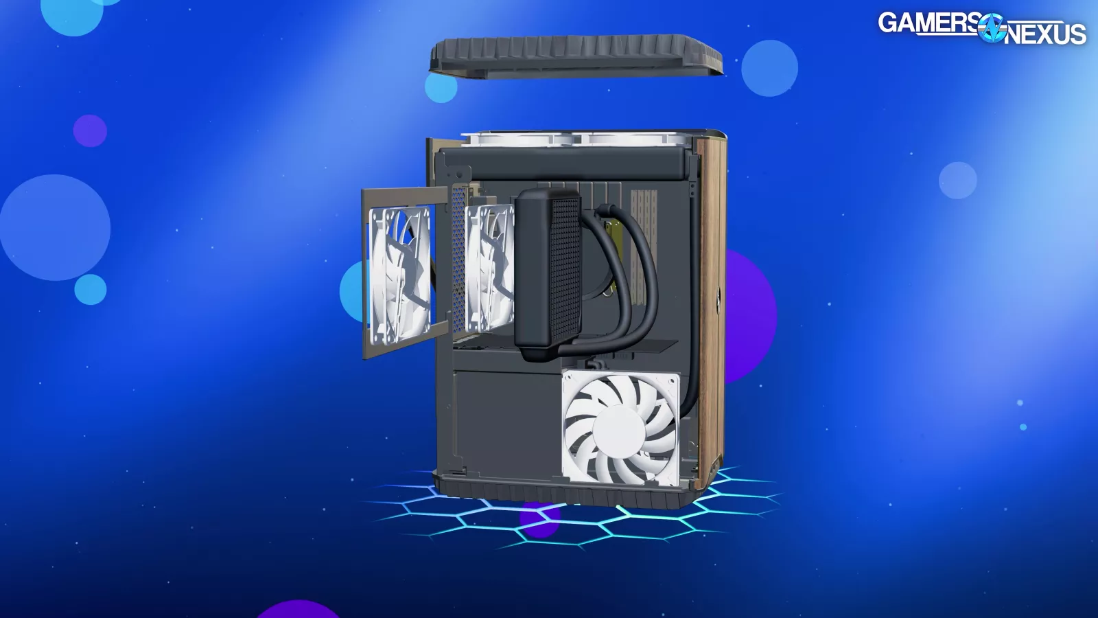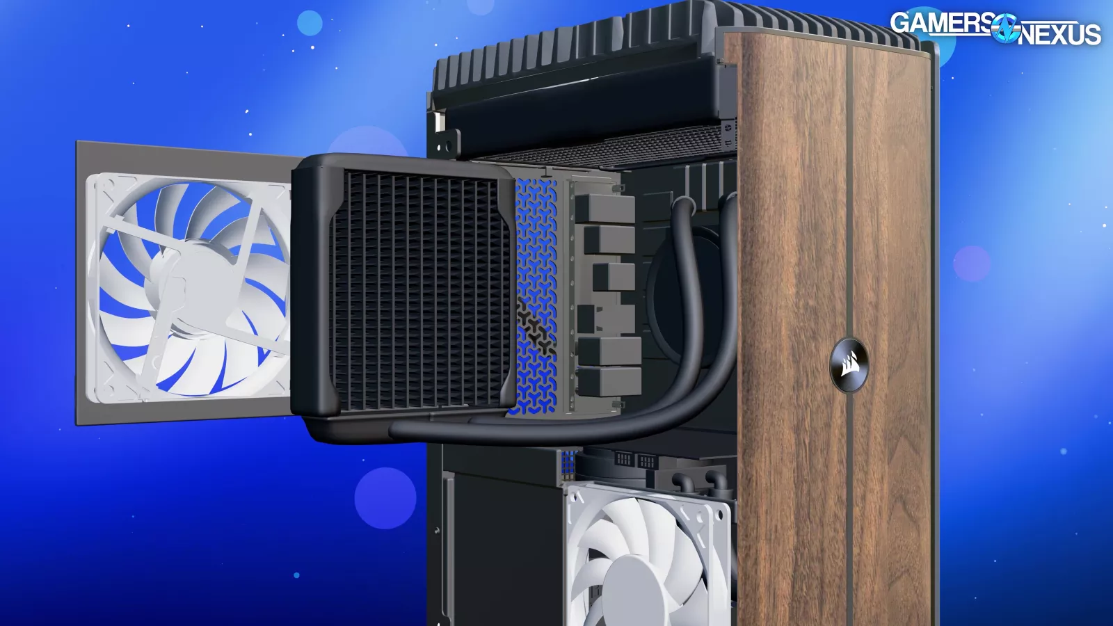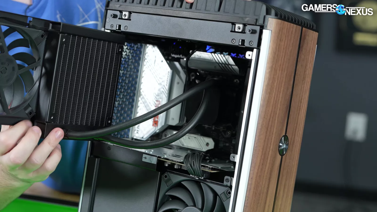 3 fans are revealed from removing the left panel. Some of these are on a hinging mechanism that we actually liked, if not for all the other problems. It’s a good way to get side intake without the panel itself being tethered to a cable. Opening the hinged door reveals the top exhaust fans mounted to the GPU radiator, with one fan attached to CPU liquid temperature.