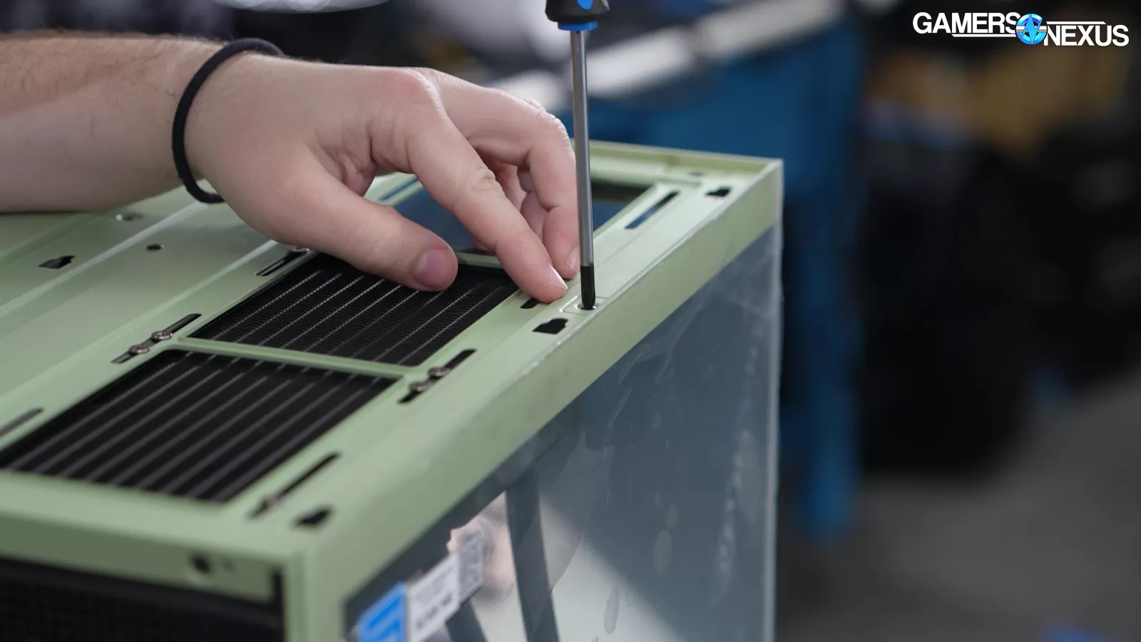 The bag of accessories inside the case has the case manual, SATA cables, WiFi antennae, extra screws, and, curiously, two 12VHPWR adapters. One of them is the official NVIDIA adapter that probably came with the 4070 Super and the other is a mismatched-white that just looks bad. Nothing in the build is white themed, so we assume this was an accidental inclusion. Including the native NVIDIA adapter is good though, as there are a lot of reasons a user may want it in the future. Keeping the card’s accessories with the card is the right move and we’re happy to see it. Some SIs just toss the extras, which could minimally pose issues for second-hand resale when done with the system.